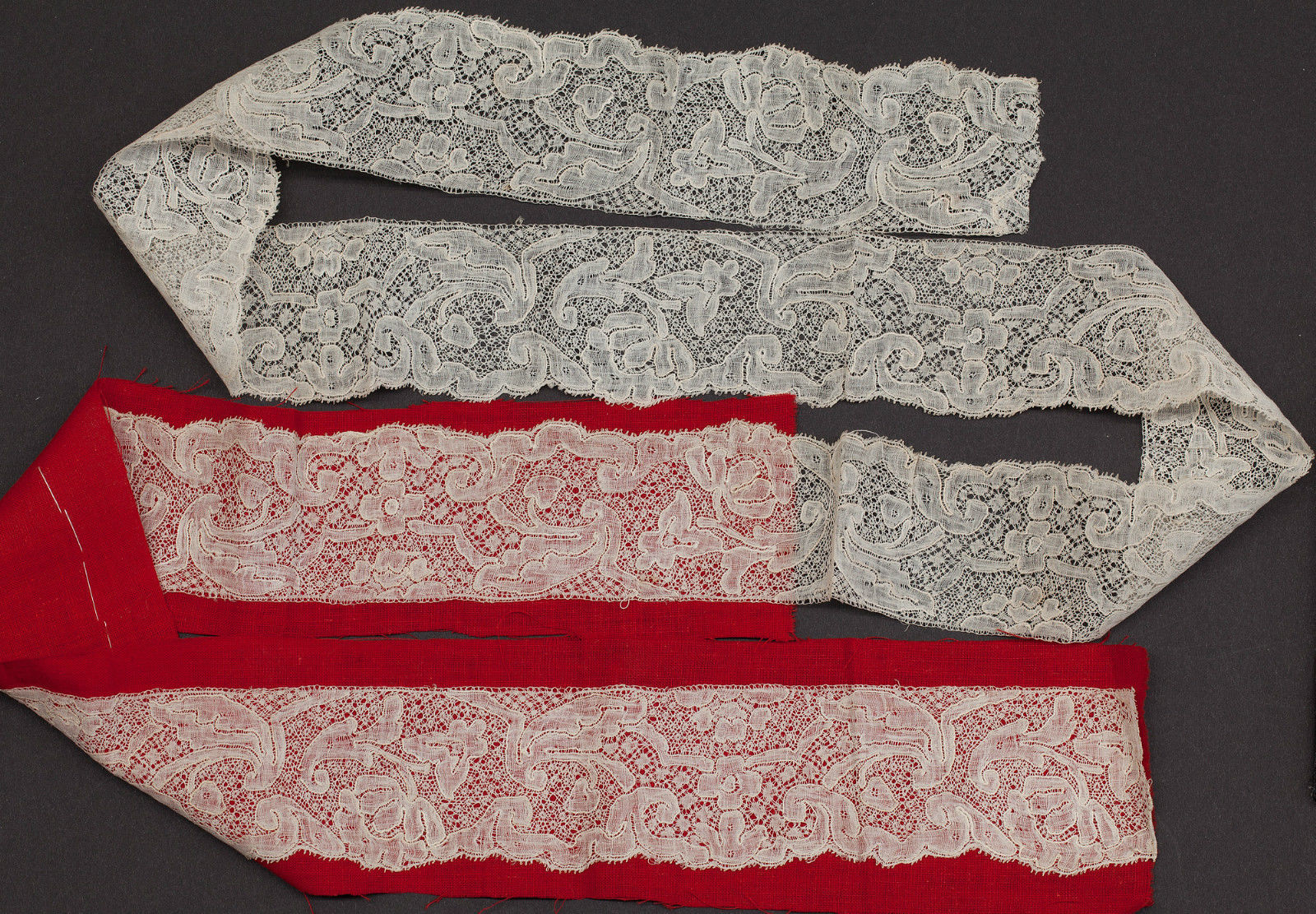 Comments: Two pieces of a Chantilly border, late 19th century. Could be Belgian. Typical romantic design, with small esprits in the ground. Later 19th c.