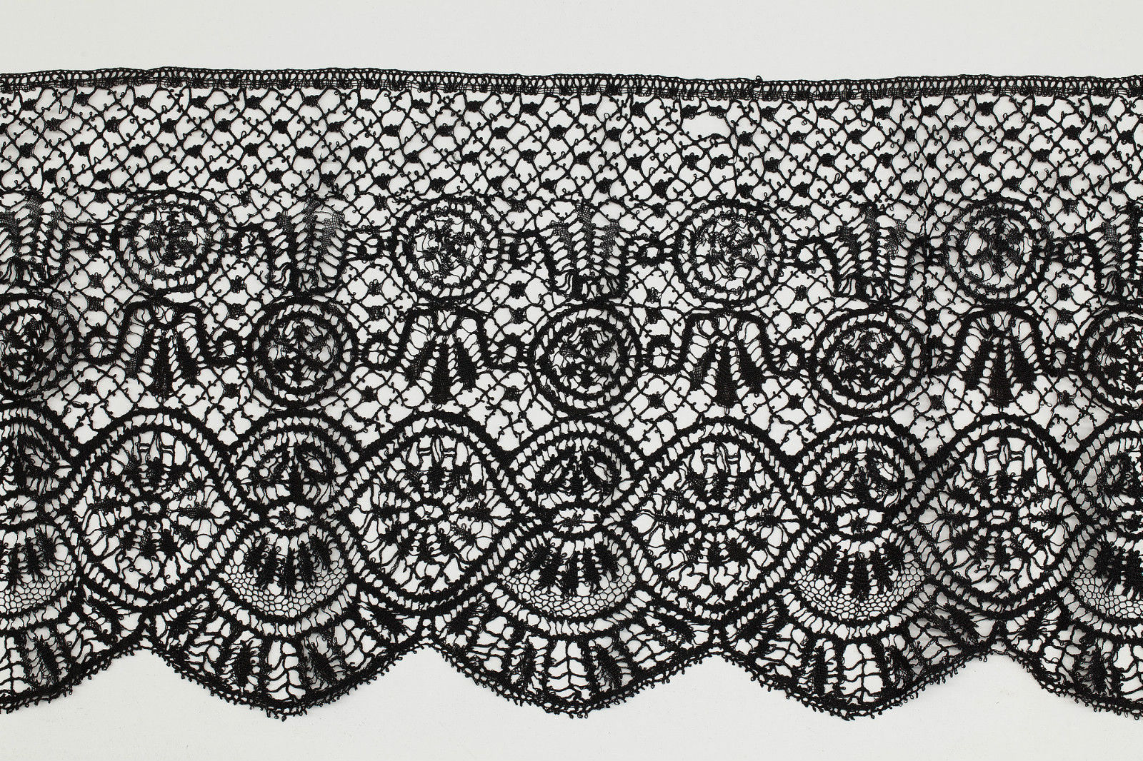 Comments: Another black silk Le Puy guipure, this one with the typical picoted 6-pointed star ground. Note the motifs against half-stitch ground in the cartouches. Narrow repeat, well worked.