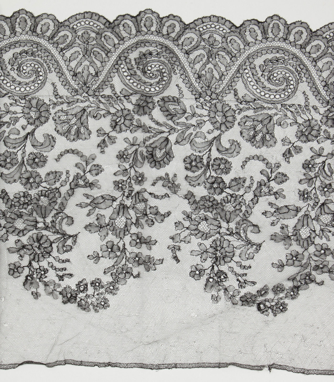 Comments: A wide Chantilly flounce. Work looks rather delicate, might be a French piece. No esprits in the upper ground, could be a slightly later 19th c piece.