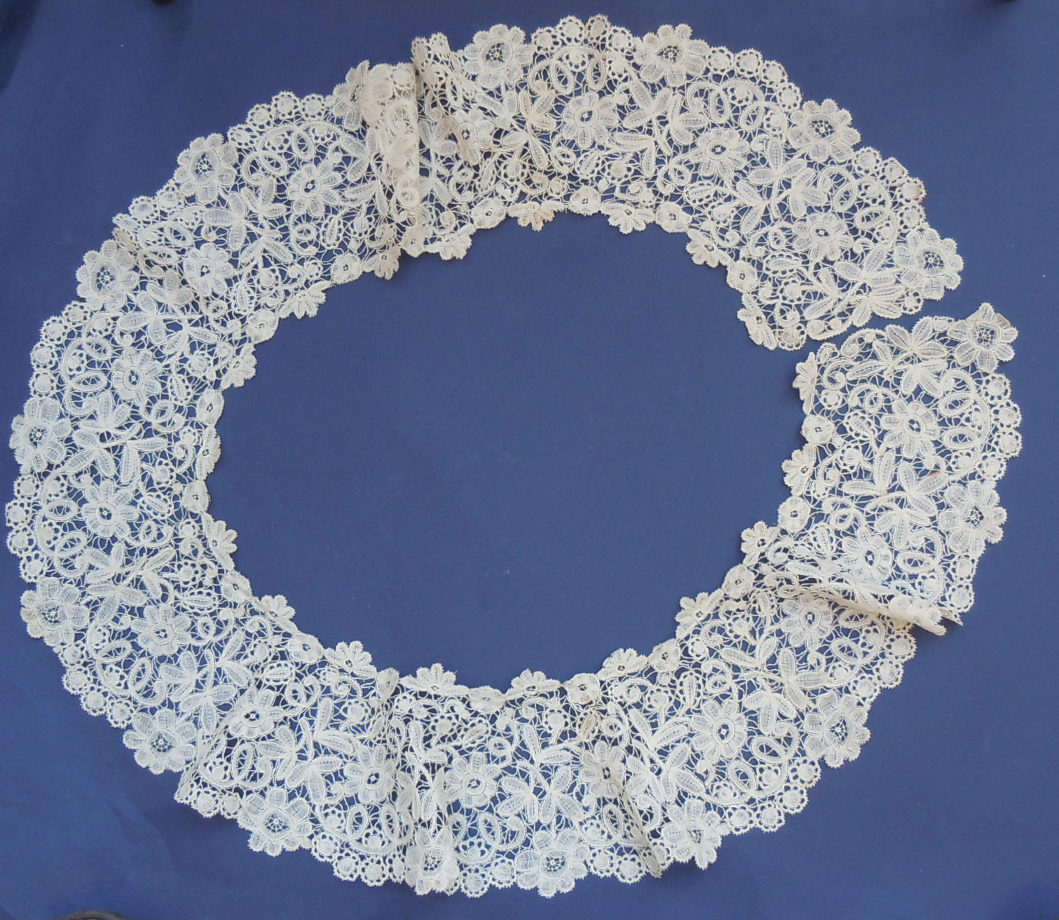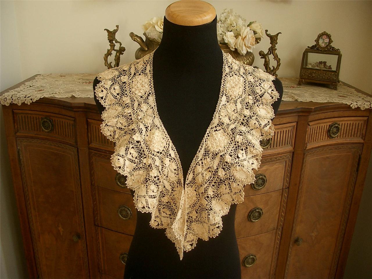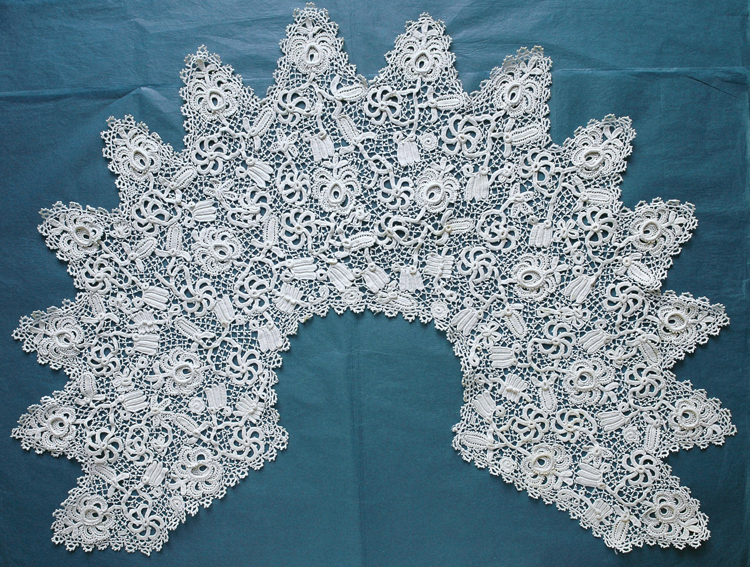 Comments: An Irish Crochet shawl collar. Extensive padded raised work often edged with picots. Picots in ground look like crocheted loops. Good, tight work.