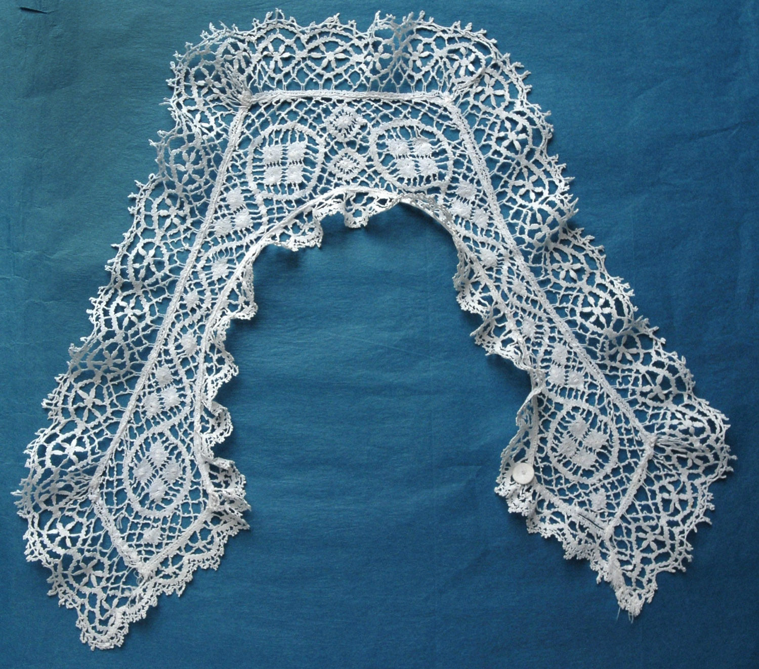 Comments: This arrangement of a center shaped collar with a plaited bobbinlace frill is not uncommon in Beds lace. This one has simple patterns of trails, woven leaves and a diamond shaped motif with raised tallies. The particular shaped form is a bit unusual.