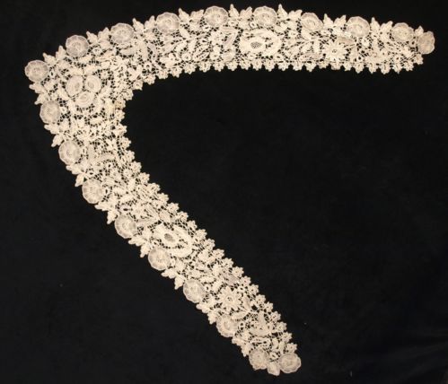 Comments: A large collar of Honiton. Note the elaborate neckline border. Well out of the snail/slugs style, yet not quite as sophisticated as some later 19th c pieces. The design is a bit scattered, like the English flower garden (some say the Devon hedge rows) so typical of Honiton. Picoted plaited bobbin ground. Note the half-stitch in the roses on the outer border, seller indicates this is a later 19th c technique.