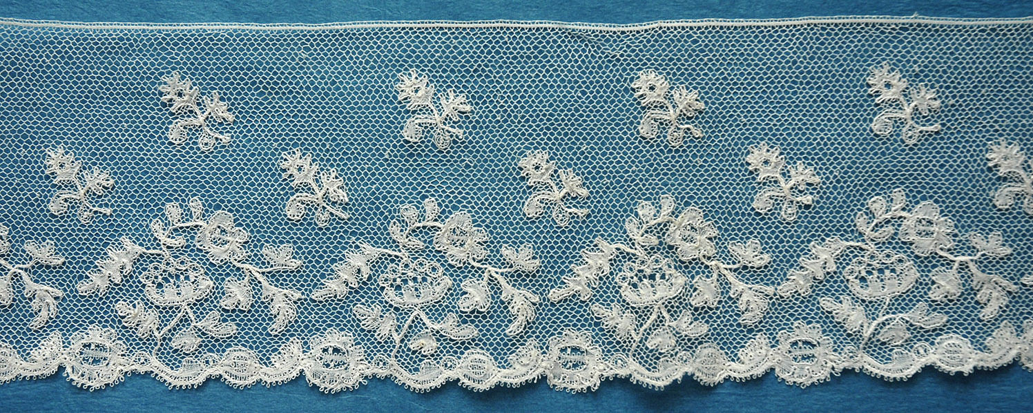 Comments: Segment of a border of Brussels needlelace with droschel ground. It has the very light look of the later 18th century. Needlelace motifs with the droschel ground doesn’t come up all that often. I like the design – the technique of the motifs is a little ‘spidery’, but appropriate to the piece.