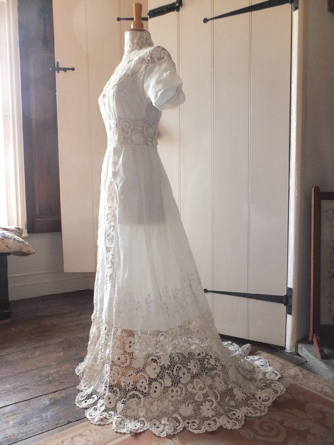 Comments: A white summer dress (Edwardian?) with good Irish crochet decoration. Motifs are fairly large, crochet chain picots in the bride ground. An impressive dress, wish the fashion would come back.