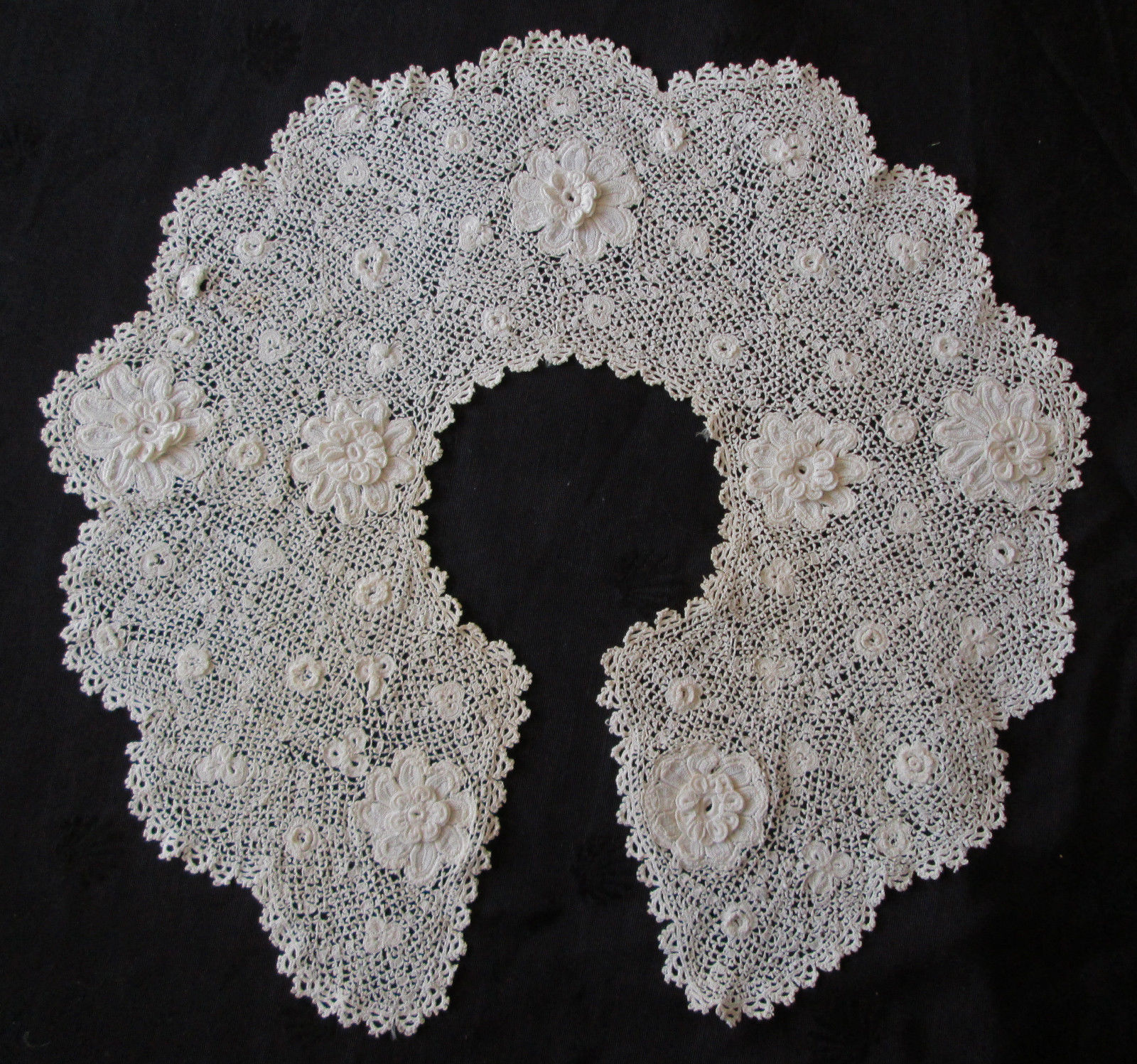 Comments: A Cantu bertha. Good typical example, with hook and 5-petal flower motifs. No figural work. Collars like this are a little rare, mostly this lace was used for table linens.
