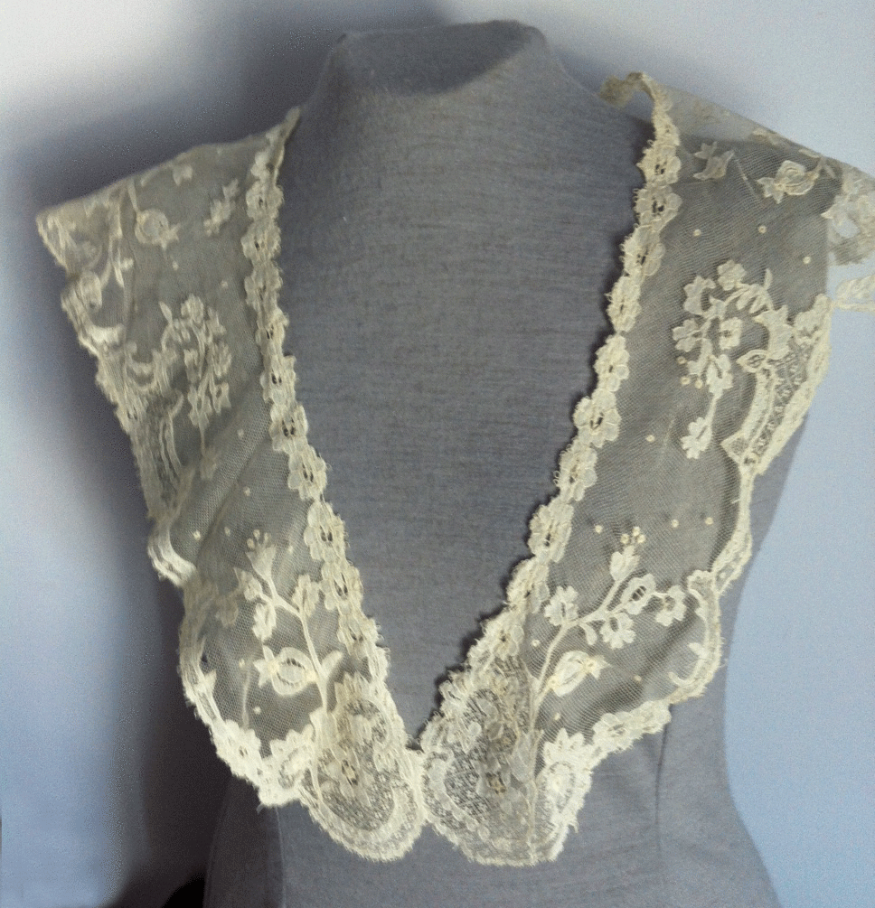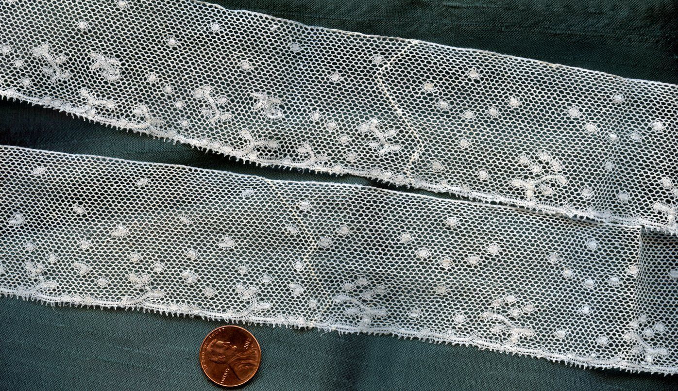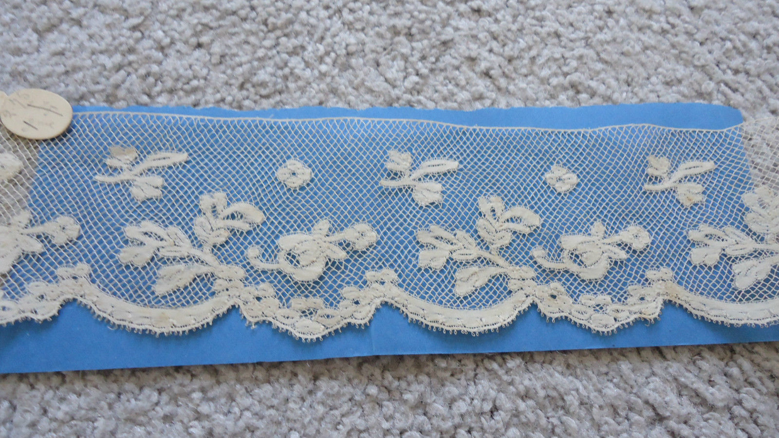 Comments: This is a delicate piece with a straight lower edge, often taken to mean an early 19th c date. It can be incredibly delicate, with a pattern that appears to be made up of small almost circular elements assembled into motifs. The mesh of ’round hole’ Valenciennes is easily distinguished from the square mesh variety. Lace of this type was made in various places, and is a collecting area all in itself, and you do see similar patterns in square mesh. I’ve seen pieces from extraordinarily fine to fairly coarse labeled ‘Valenciennes Anglaise’, or ‘Fausse Valenciennes’. It is unfortunately, very little researched.