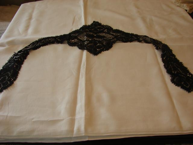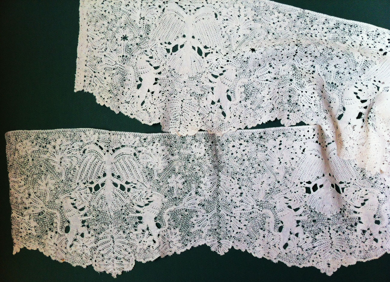 Comments: A border of cream silk Blonde de Caen bobbinlace, very typical large swirling design. This is a very delicate lace and often does not survive well. Excellent contrast between the heavy cloth and lighter half stitches, and note the openwork in the leaf border.