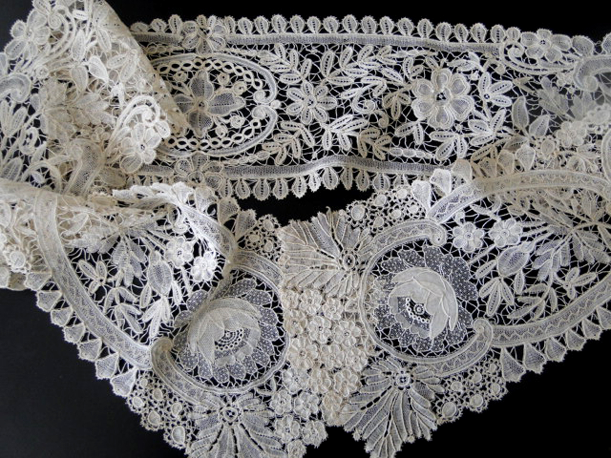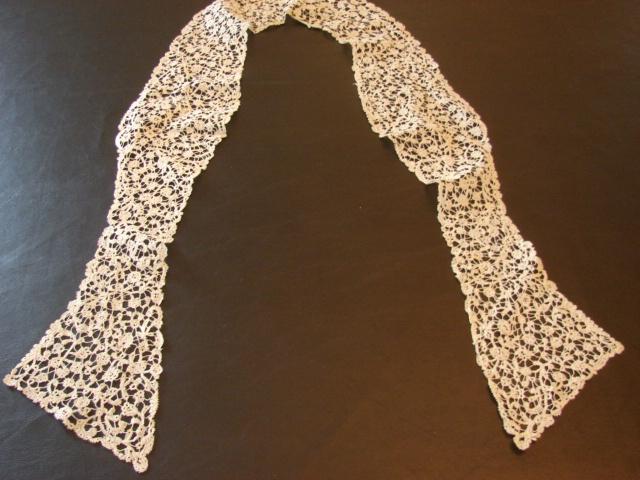 Comments: A narrow scarf of Brussels Duchesse. Single large raised petal roses at the ends, no needle-made ground. Not enough photos to tell if there is more needlelace further up. Both bobbin- and needle-made motifs are finely done.