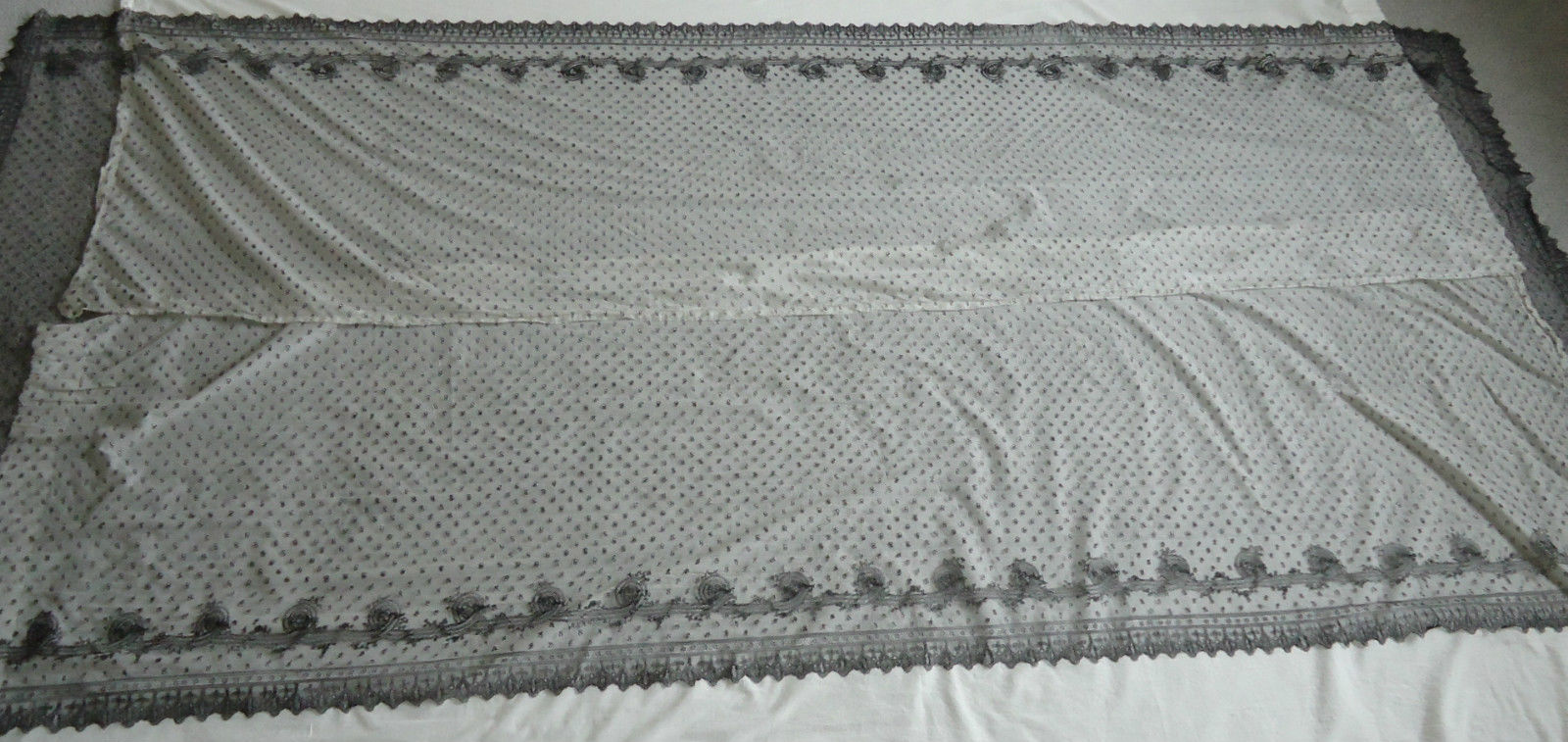 Comments: A needlerun net rectangular shawl – hard to tell the origin. It has the Blonde de Caen design look, with large flower sprays massed at the ends. The embroidery is quite solid, done with a heavier thread, as are the filling stitches.