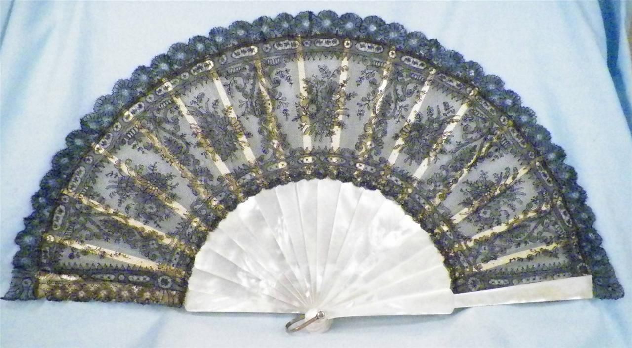http://tinyurl.com/q38prob Antique Chantilly Lace Folding Fan Mother of Pearl Sticks Guards Victorian Great