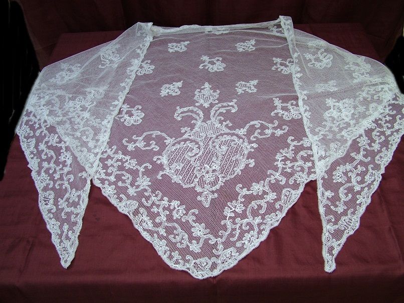 Comments: A short scarf of Honiton with scalloped edge, snails/slugs style. Some of the flower motifs are quite interesting. Ground is needle-made. Extensive leadwork fillings.