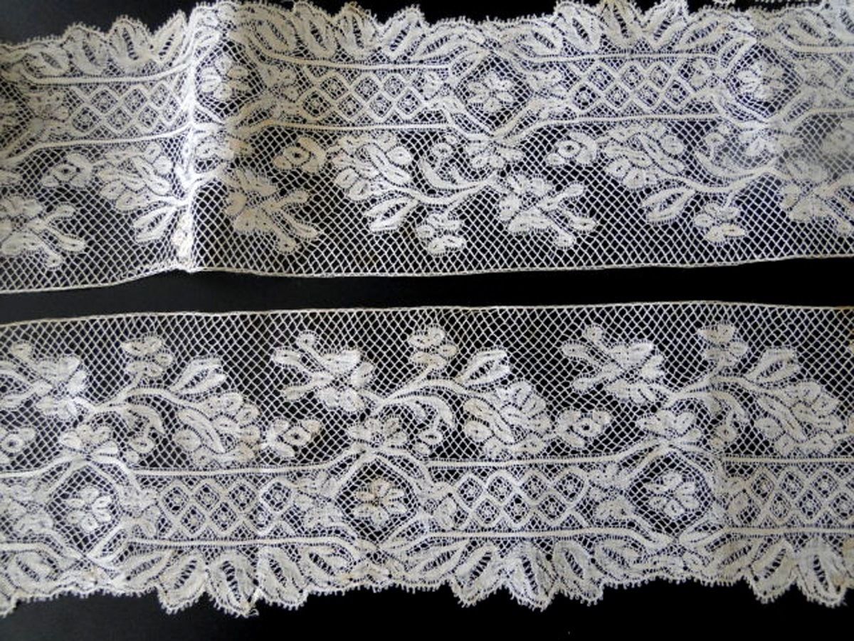 Comments: A border of complex Valenciennes. Very finely worked, note the fairly narrow width. As the seller notes, this is a top quality ‘summer lace’, and was also often used for bed linens.