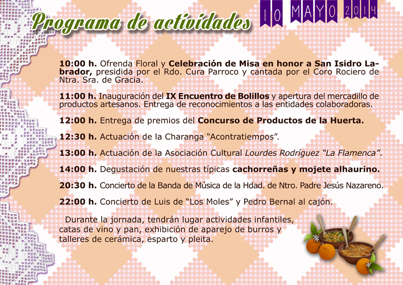 This is part of the annual Fiesta de La Cachorreña, in honor of San Isidro Labrador. The Fiesta celebrates local agriculture and crafts. About 500 lacemakers are expected to attend.