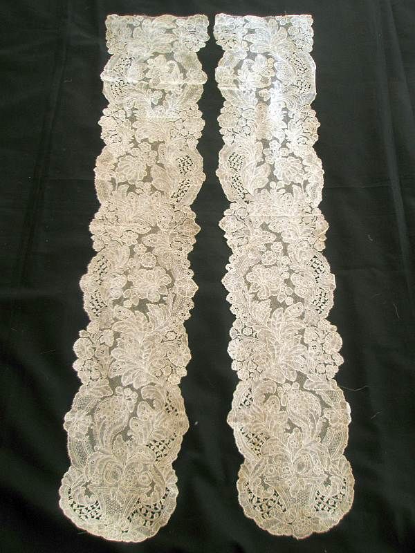 Comments: A pair of Brussels bobbinlace lappets with droschel ground. Around 1740. Excellent design and technique. The design is a bit crowded, but that’s nitpicking. This is a major set.
