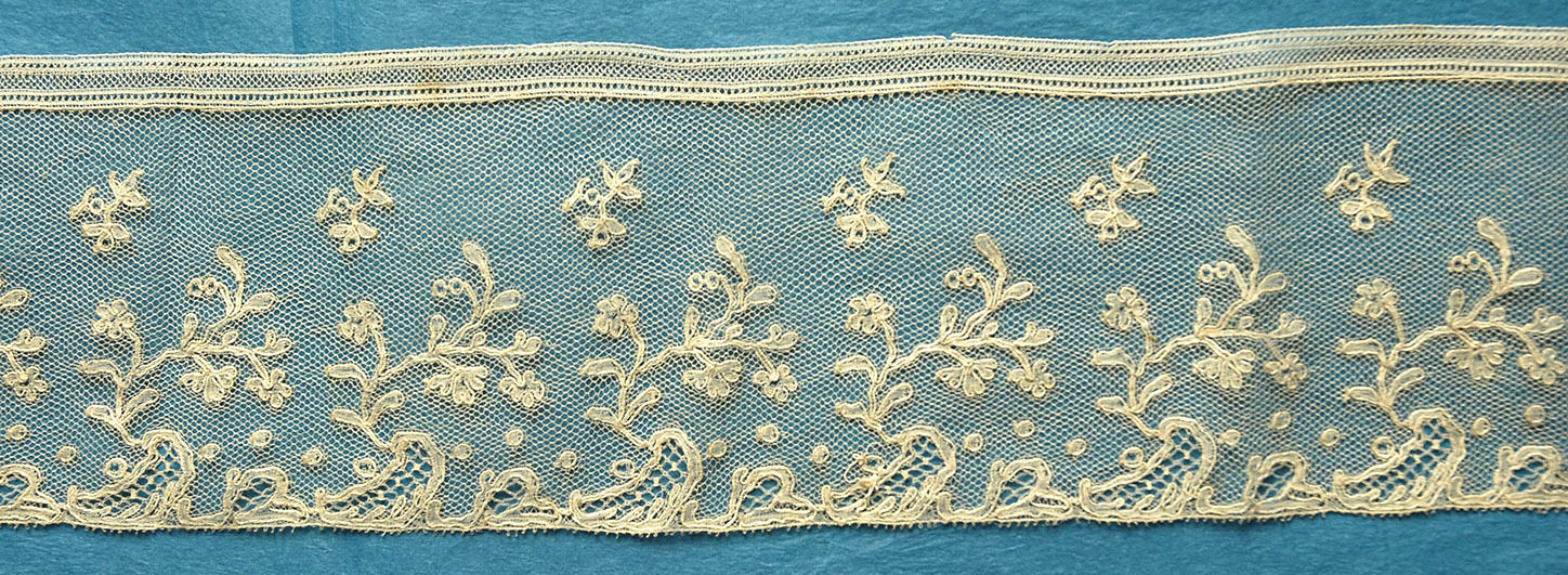 Comments: A Mechlin border, probably mid 19th c. It has a straight lower border and rather thin motifs, reminiscent of Arras work. Good short repeat, nice technique, simple fillings with a few woven tallies.