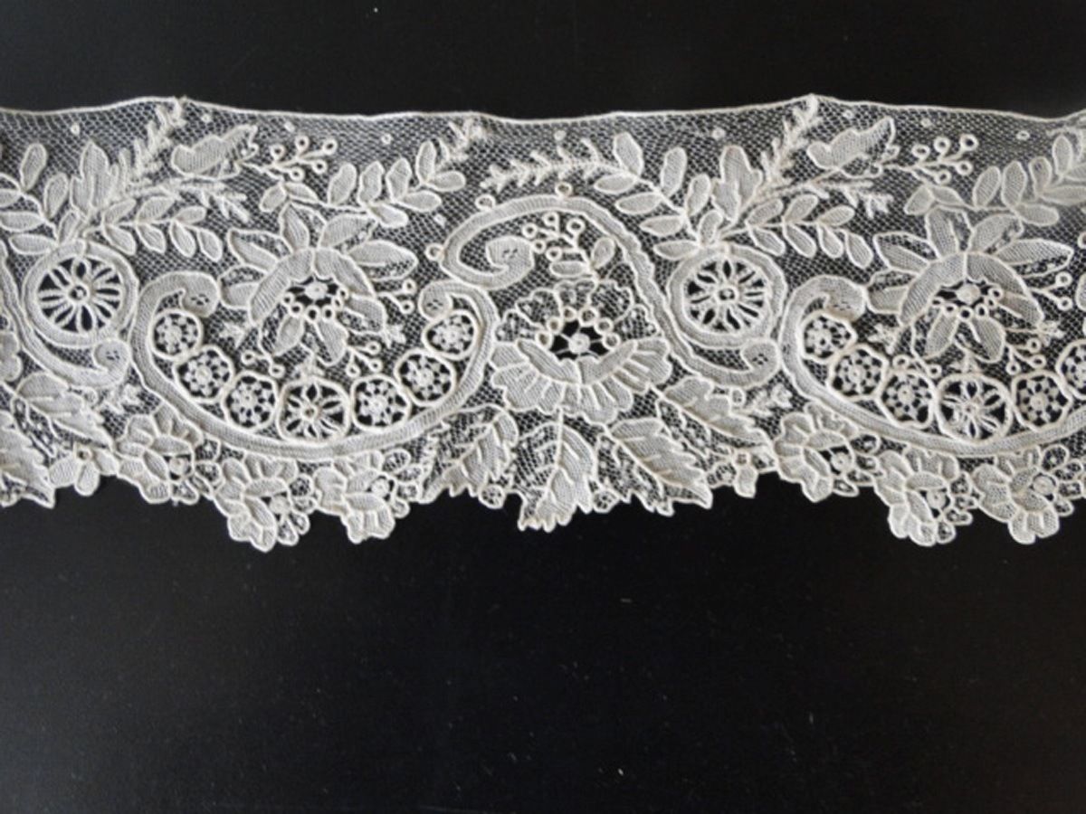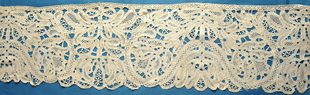 Comments: A long length of Bruges Bloemwerk, with the lower edge looking more like a tape lace. The work is a bit light. Typical ‘islands’ in the brides. Simple fillings, good, practical design.
