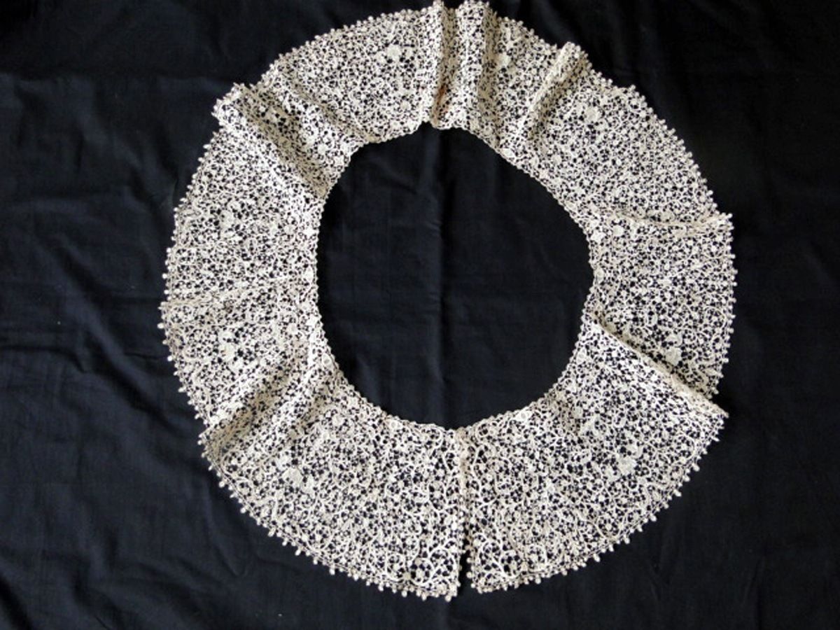 Comments: Years ago I visited the Jesurum lace shop in Venice and got a showing of the collection from their old factory by Mario Moreno Levi. We looked at a lot of pieces like this, he even gave me a sample to take home, which I still have. He told me how the workers were selected based on their type of hands to specialize in all the steps in manufacturing this lace. It is a bertha, copying the 17th century Punto Neve (Point de Neige in France), with well done raised work and great detail in the brides. Probably made at the Queen Margharita school in the Burano technique, and I’m guessing early 20th century. A really beautiful piece.