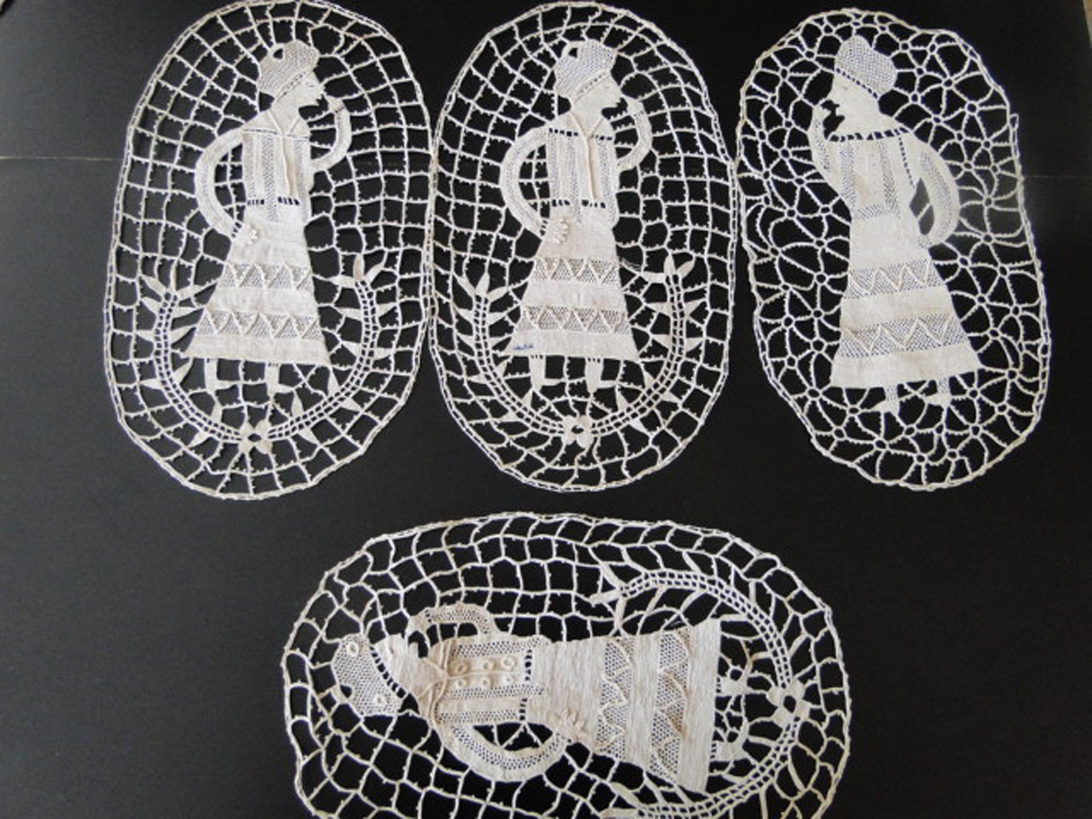 Comments: Four ovals of a free reticella needlelace, probably Greek given the angular appearance and the raised work decoration. All basically the same pattern, although the third one has a different ground and is facing the opposite way from the others. We see a lot of figural bobbinlace from Italy like this, but needlelace doesn’t come up too often.