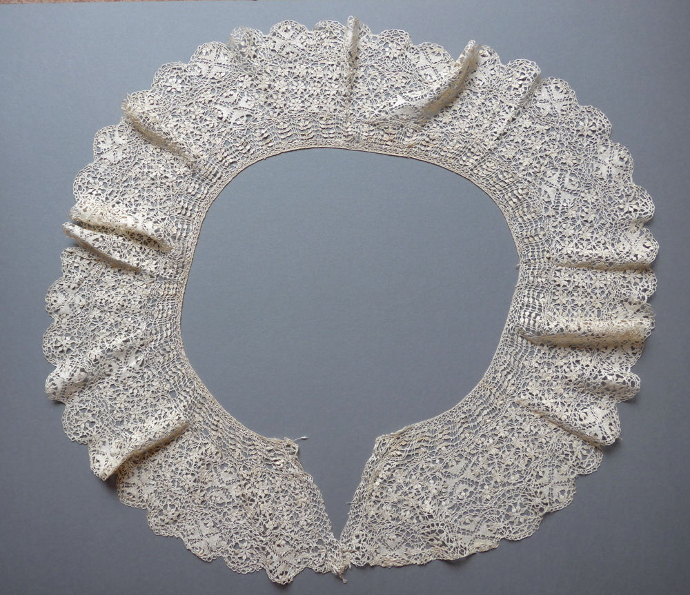 Comments: A small Honiton round collar. Snails/slugs style with picoted brides, quite nicely worked. Thistle and flower design, overall If ind it quite pleasing.