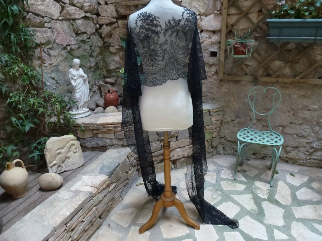 Comments: A very wide, long Chantilly border. Typical romantic floral border with swags along the lower edge. No esprits in the upper ground. Hard to tell the density of color, which is one means of distinguishing Belgian from French products.