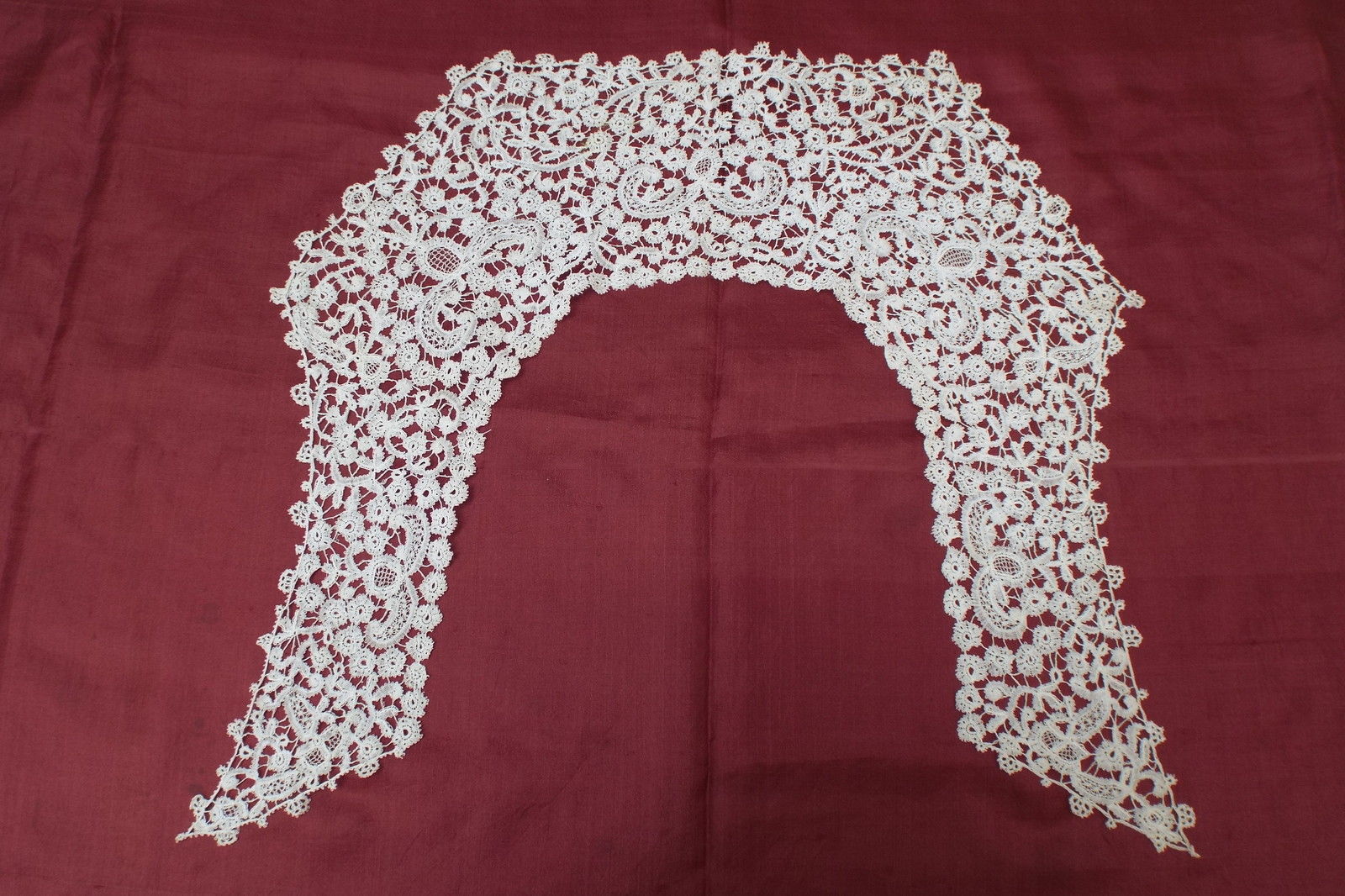 Modifications: Cut both ends, engrelure added. The picot edge at the lower border is a later addition. I think I see one seam near one end.