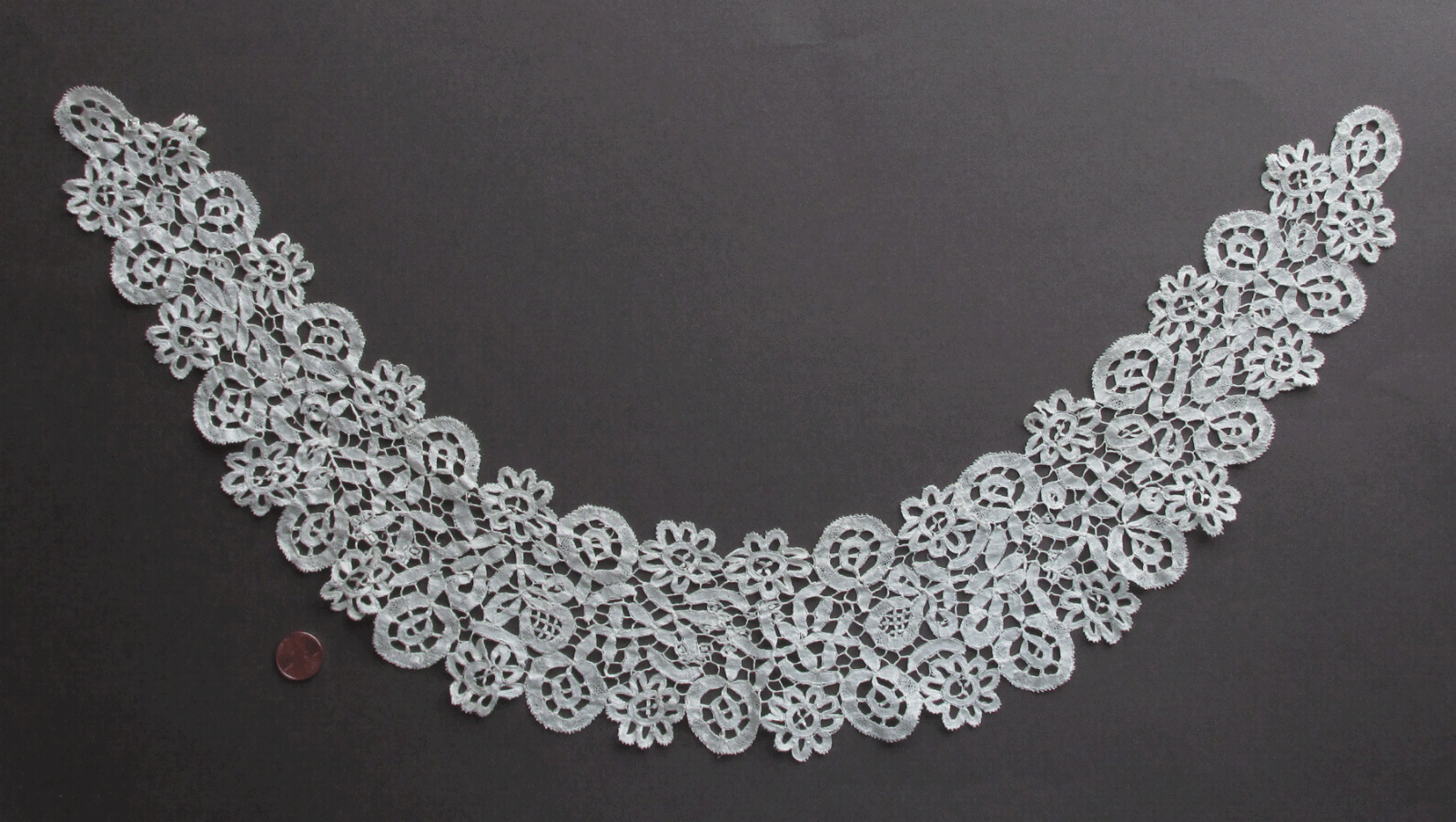Comments: A collar of Honiton guipure. Snails/slugs style with minimal fillings, plaited, un-picoted brides. That sounds pretty simple, but the piece actually has a nice look to it.