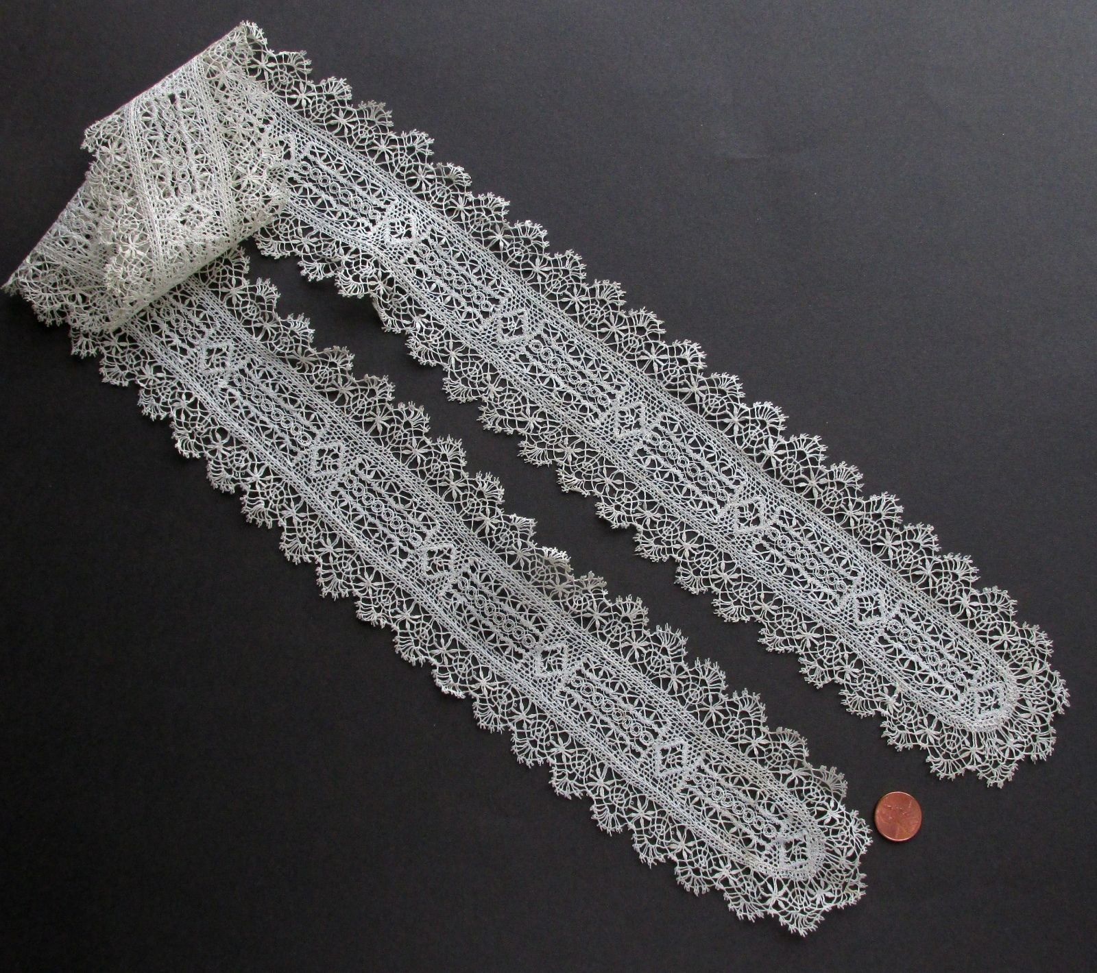 Comments: This one is a mystery. A largely plaited narrow scarf, and it does have the early Venetian plaited lace design look, as the seller notes. But the Venetians would not have done the woven leaves – that’s more a Genoese technique. And the center portion is pure 19th-20th century. I’ll guess a French Cluny variation.