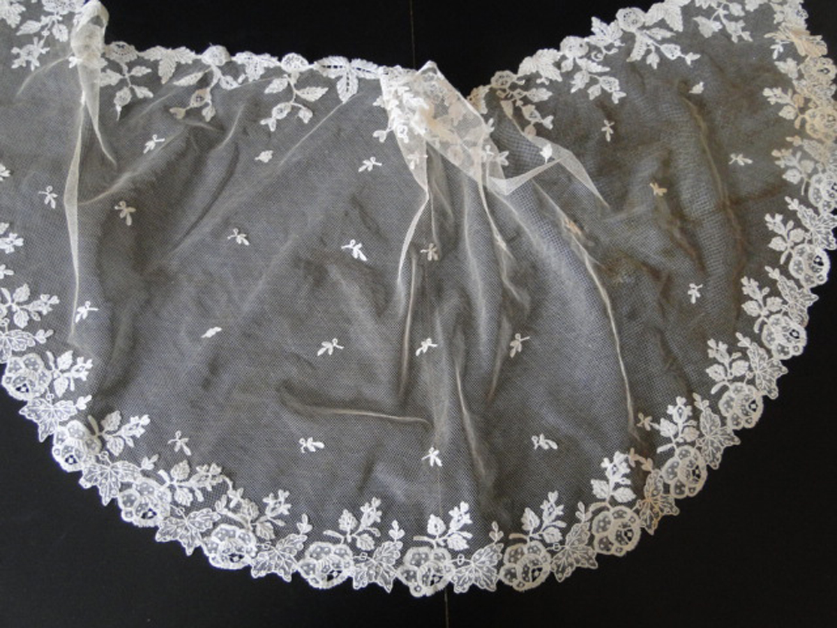 Comments: A semi-circular bonnet veil of Brussels bobbin and needle lace appliqued on machine net. The bobbin-made roses along the border alternate with needlelace leaves. Some delicate sprigs used as esprits, and some simple needle-made decorations in flower centers.