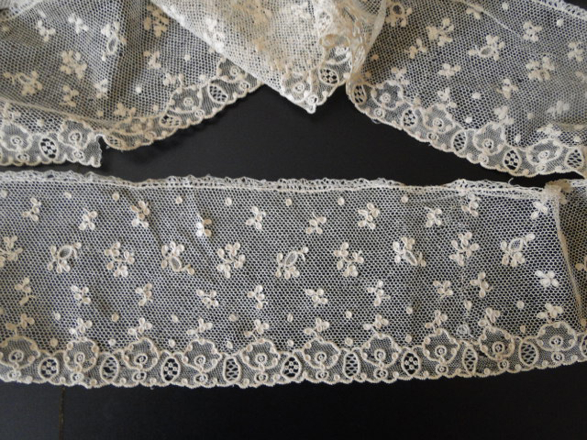 Modifications: Reworked, probably from a flounce, with additional bobbin-made border added around ends and up one side. The border on the other side looks more in keeping with this style. Hard to say when the modification was done.