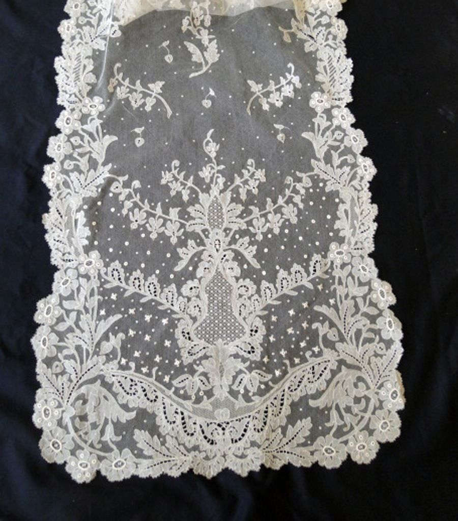 Comments: Wish there were more closeups, but I think this is a Lille border. The type of floral motifs, and the straight edge are often found in this lace. And note the woven tallies in the point ground, also characteristic.