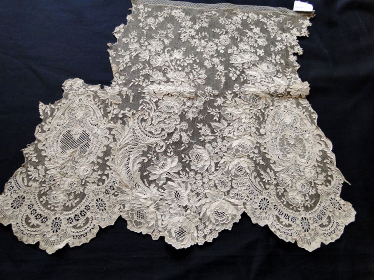 Comments: Hmmm. I think this is Alençon, a fragment of a fairly wide border. Thje design is very much in the Brussels Point de Gaze style, but the toilé is much too dense, the the decorative ‘mode’ fillings very elaborate. The petals of the roses are also not raised, just sculpted with the cordonnet. Also the picots on the lower border are not typical of Point de Gaze – they look like horsehair-made picots with the horsehair taken out. I wish there was an extreme closeup of the mesh which could settle the matter. I’m also thinking this might have been all there was made, and it’s not cut from a longer piece. That’s just a feeling from what I can see of the ‘cut’ ends. It’s quite an extraordinary piece.