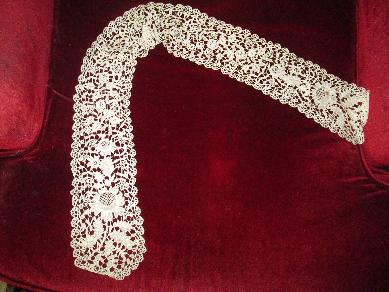 Comments: An long collar of Rosaline bobbinlace. No raised ‘perls’, but there are some raised edges. This is a fine delicate lace normally of excellent design and this piece is no exception.