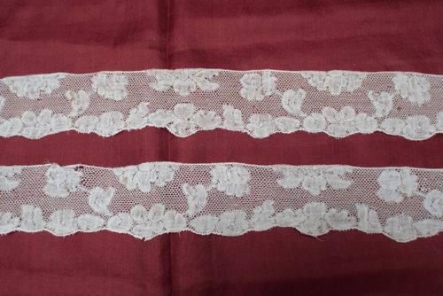 Comments: A narrow border of mid 18th c round hole Valenciennes. The design is such that you can match the pattern in a mirror image along it’s length – this was occasionally done to get a wider piece. The design is quite flat, no fillings, just a solid line-drawing pattern. Excellent even technique.
