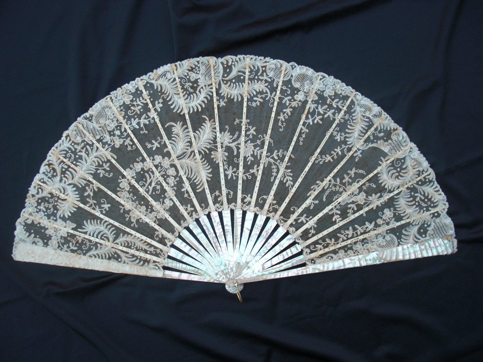 http://tinyurl.com/klzjk5j large antique fan mpo handmade (?) lace silver incrusted gilded rivet Victorian