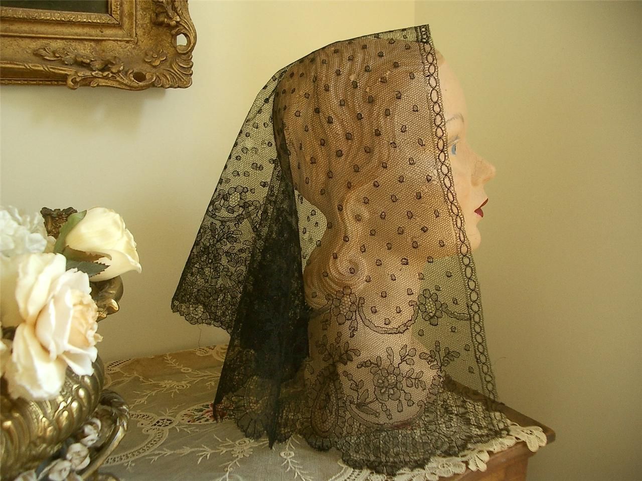 http://tinyurl.com/pny8ef4 Antique Chantilly Lace Mantilla Veil Scarf Black 84″ x 21″ C. 1850’s VC63