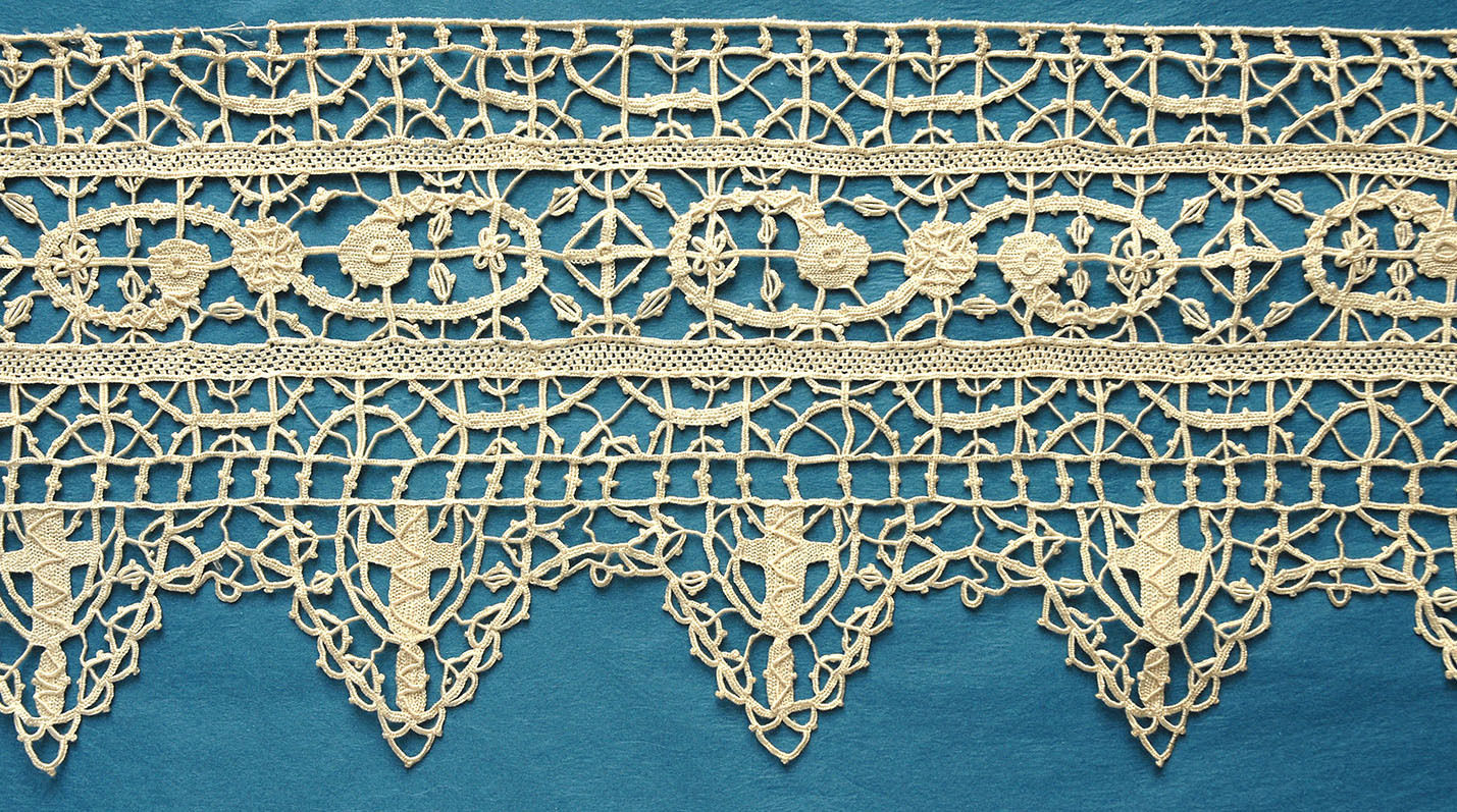 Comment: A long border of Point de Gaze with an elegant, higher-end market design. No raised work, but it doesn’t need any. The flowers are quite naturalistic, and there are a variety of well-done decorative ‘mode’ fillings. It’s a little hard to see in the photos, but there seems to be widely spaced looped picots along the lower edge.