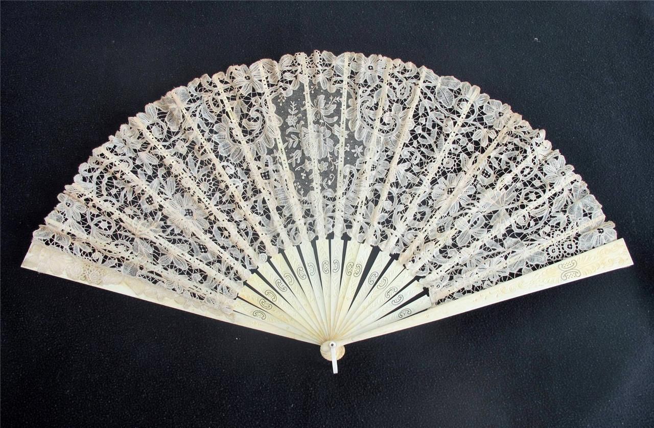 Comment: A fan of Duchesse de Bruxelles with carved bone sticks. No raised work in the nice Point de Gaze insert. Conventional Duchesse bobbin motifs with simple needle-made fillings. The overall design is a little crowded, but it works well.