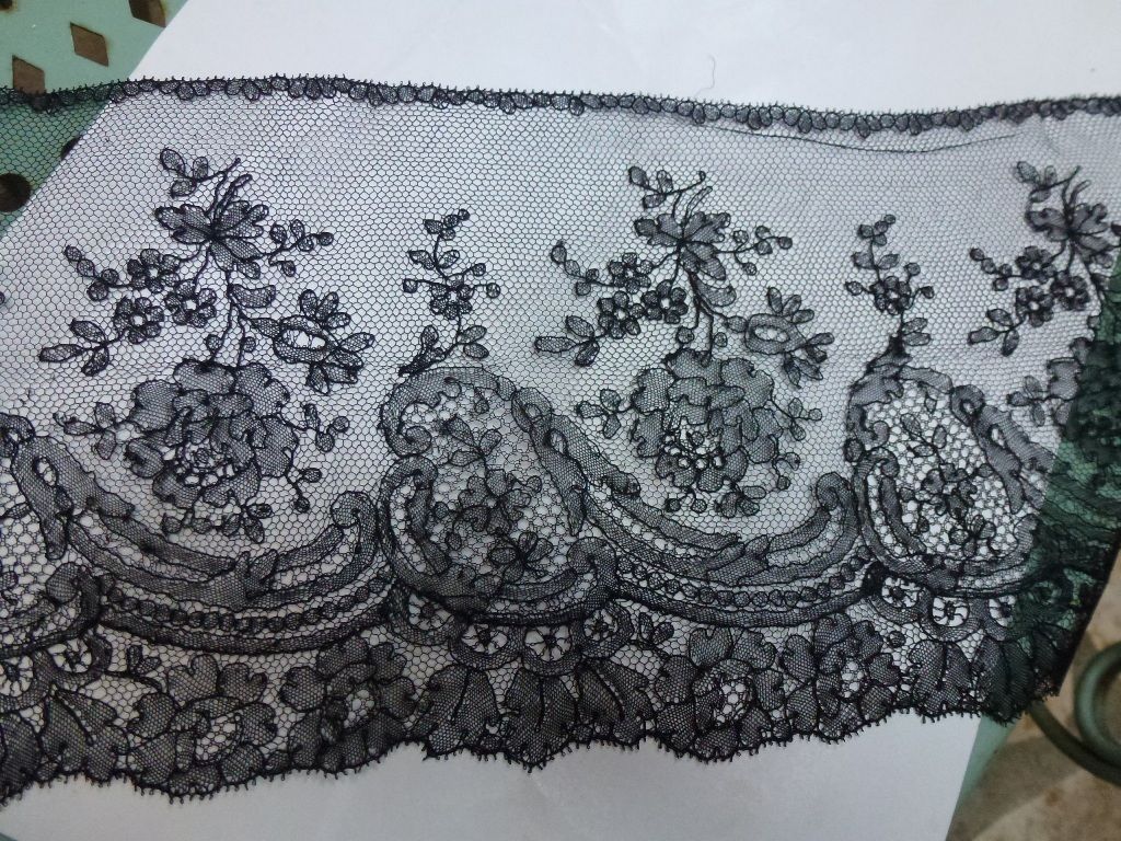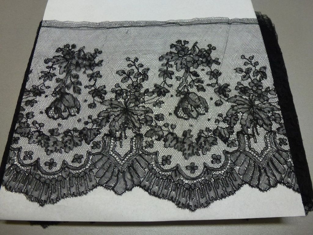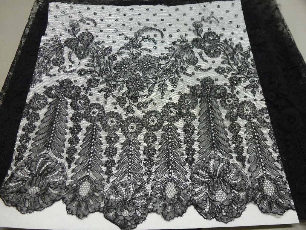 Comment: A wide, very long flounce of Chantilly. Good romantic design of flowers following an undulating trail above a vertical design of leaves. Lots of esprits in the ground. It has the very black look of Belgian products.
