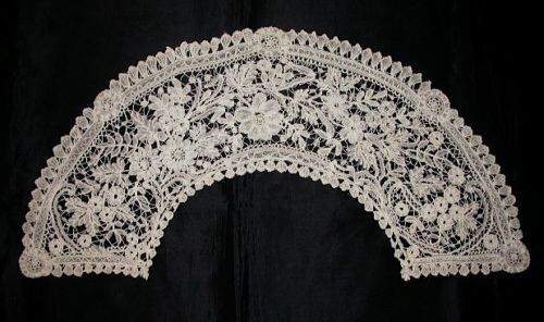 Comments: A Brussels Duchesse fan leaf, no raised work in the Point de Gaze inserts, and minimal decorative ‘mode’ fillings. Excellent design of masses of flowers all with a nice flow across the leaf. Bobbin motifs are fairly conventional, but well used in the entire design.
