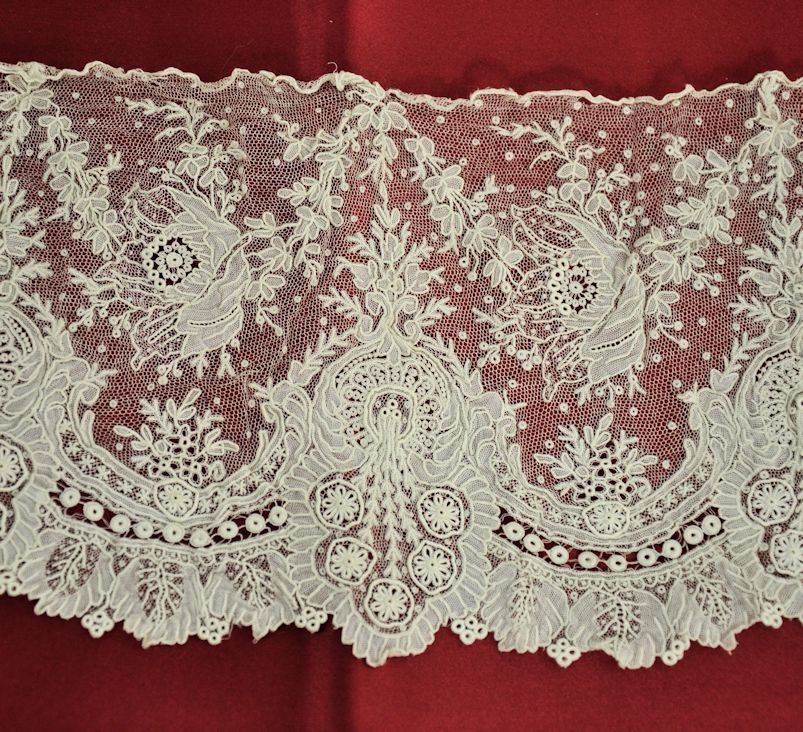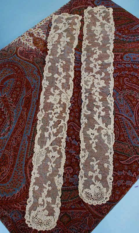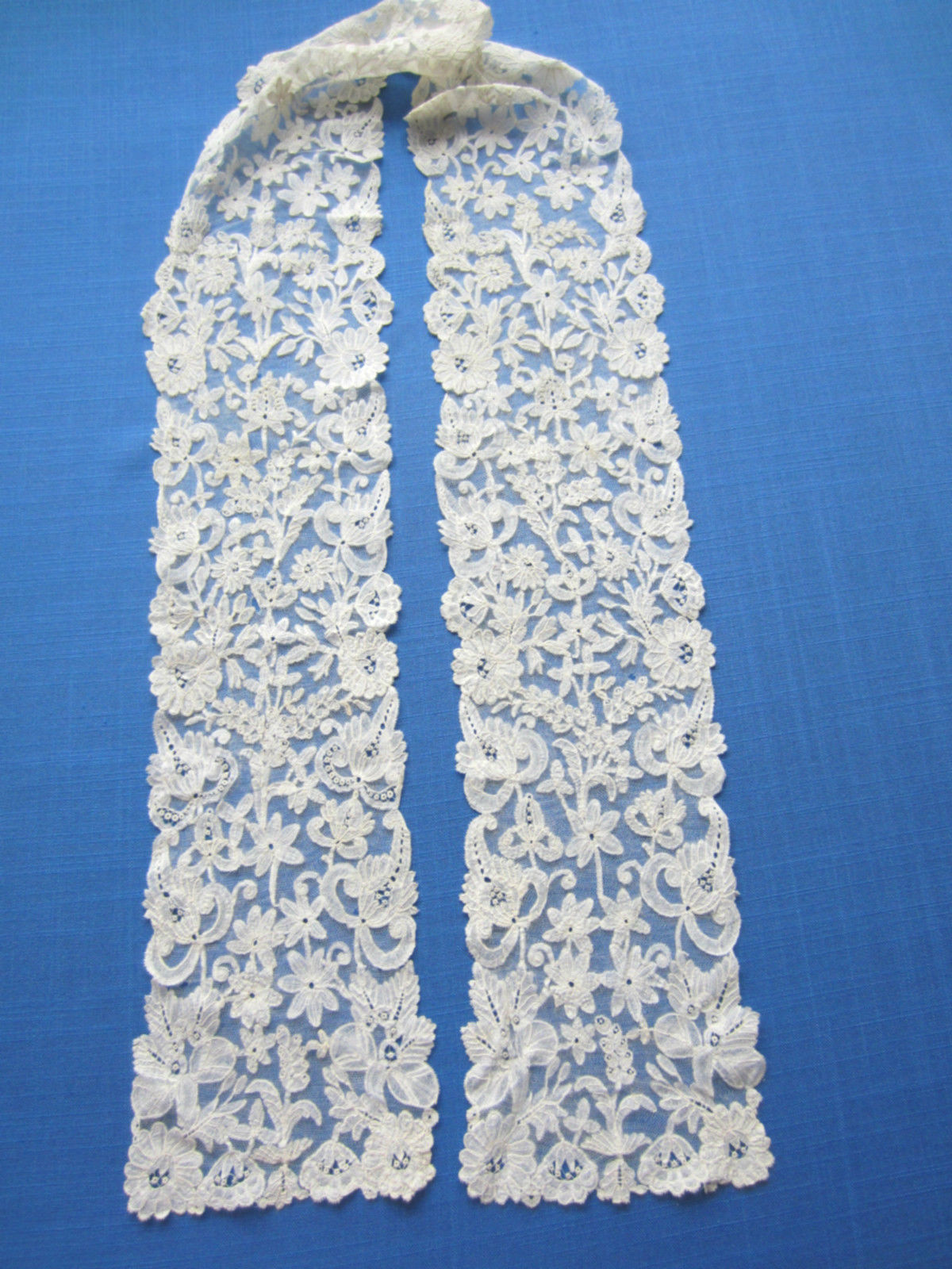 Comment: A narrow scarf of Point d’Angleterre, fine bobbin-made motifs with a Point de Gaze ground and raised needle-made rings used as fillings. An interesting piece, and one of the better later 19th c Belgian laces. The design is quite dense and some of the motifs show nice originality.