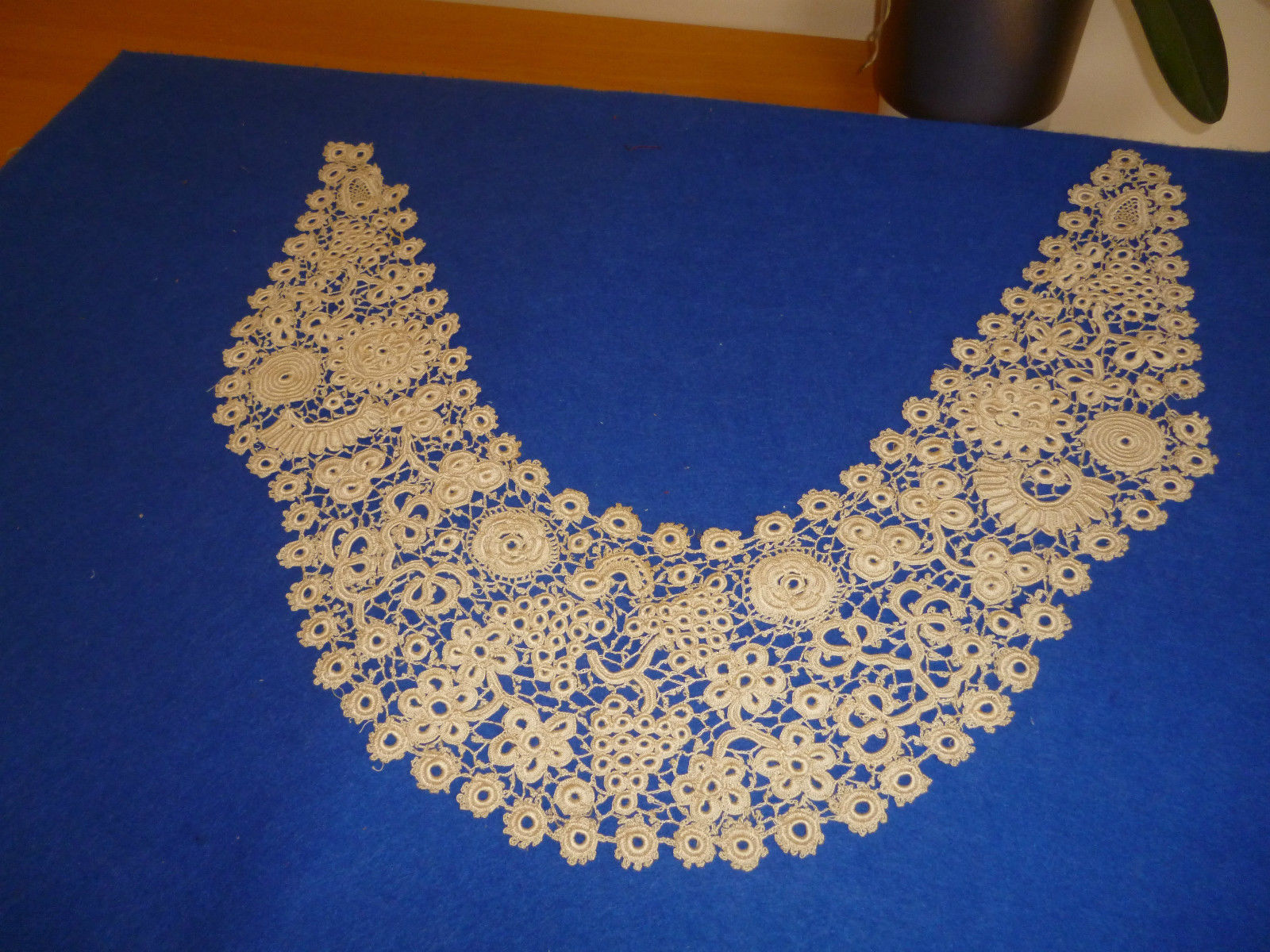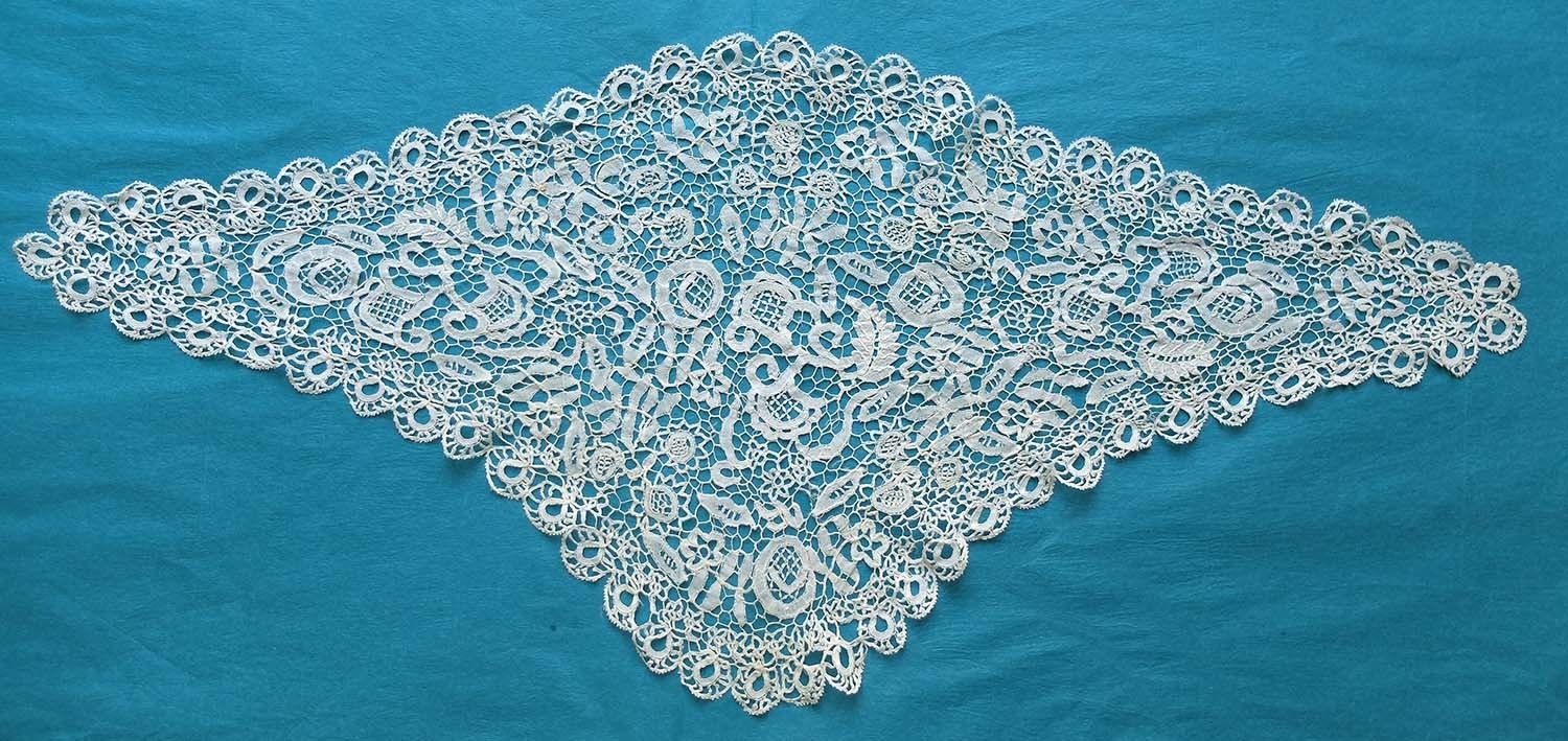 Comment: An Irish Crochet dress front, although with the long points it would be used as a collar with the bib to the back. Interesting technique – everything seems to be built on the base thread with one single additional row. Gives it a tape-like appearance and some freedom in motif design. Lots of raised work.