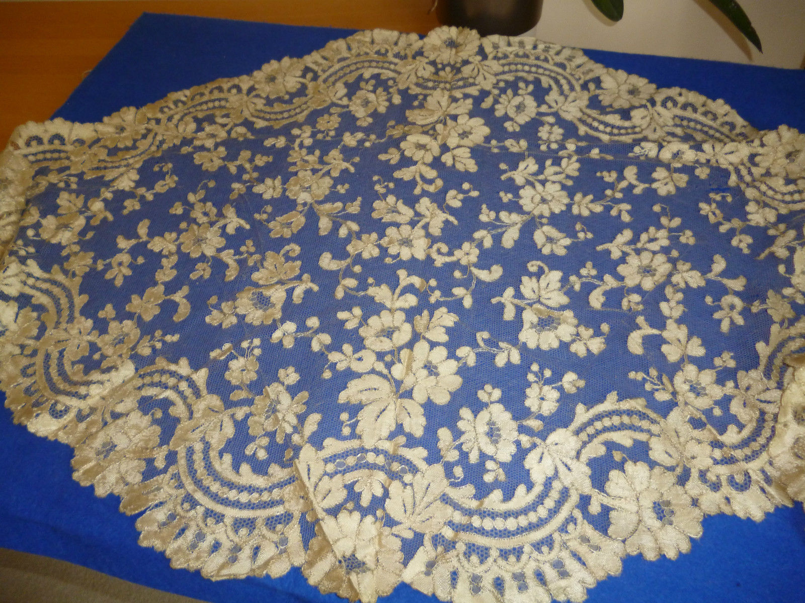 Comments: A white or cream silk blonde mantilla. French or Spanish, hard to tell given the design. The fillings are a honeycomb rather than the 6-pointed star favored in the Catalonian blondes. Floral design with a heavy border – technique is excellent, the design is not very elaborate, but effective.