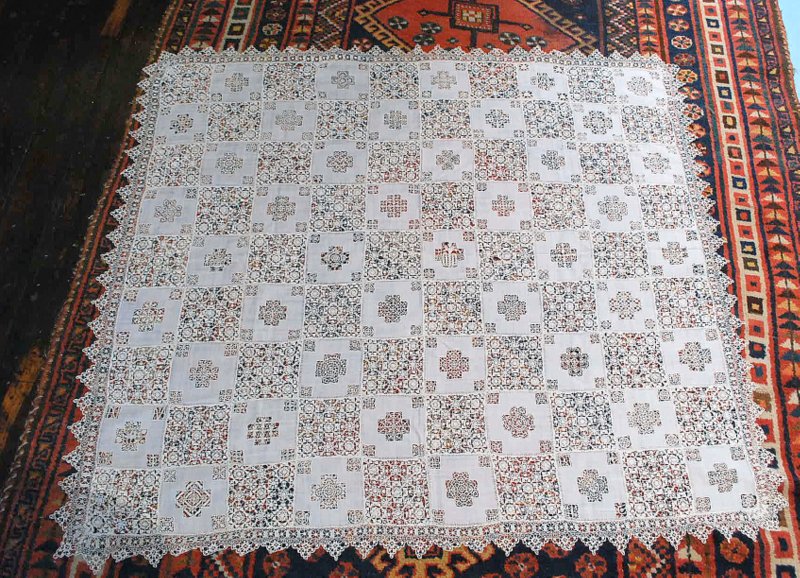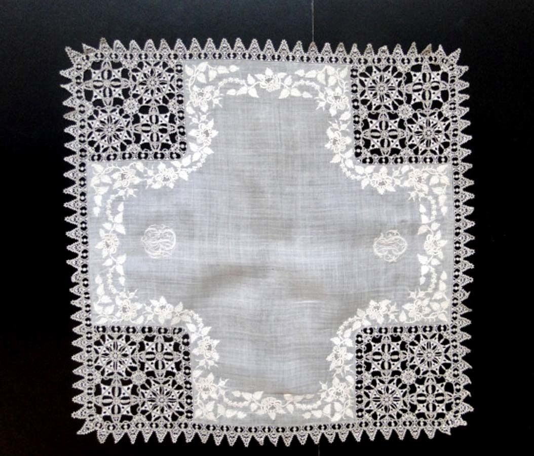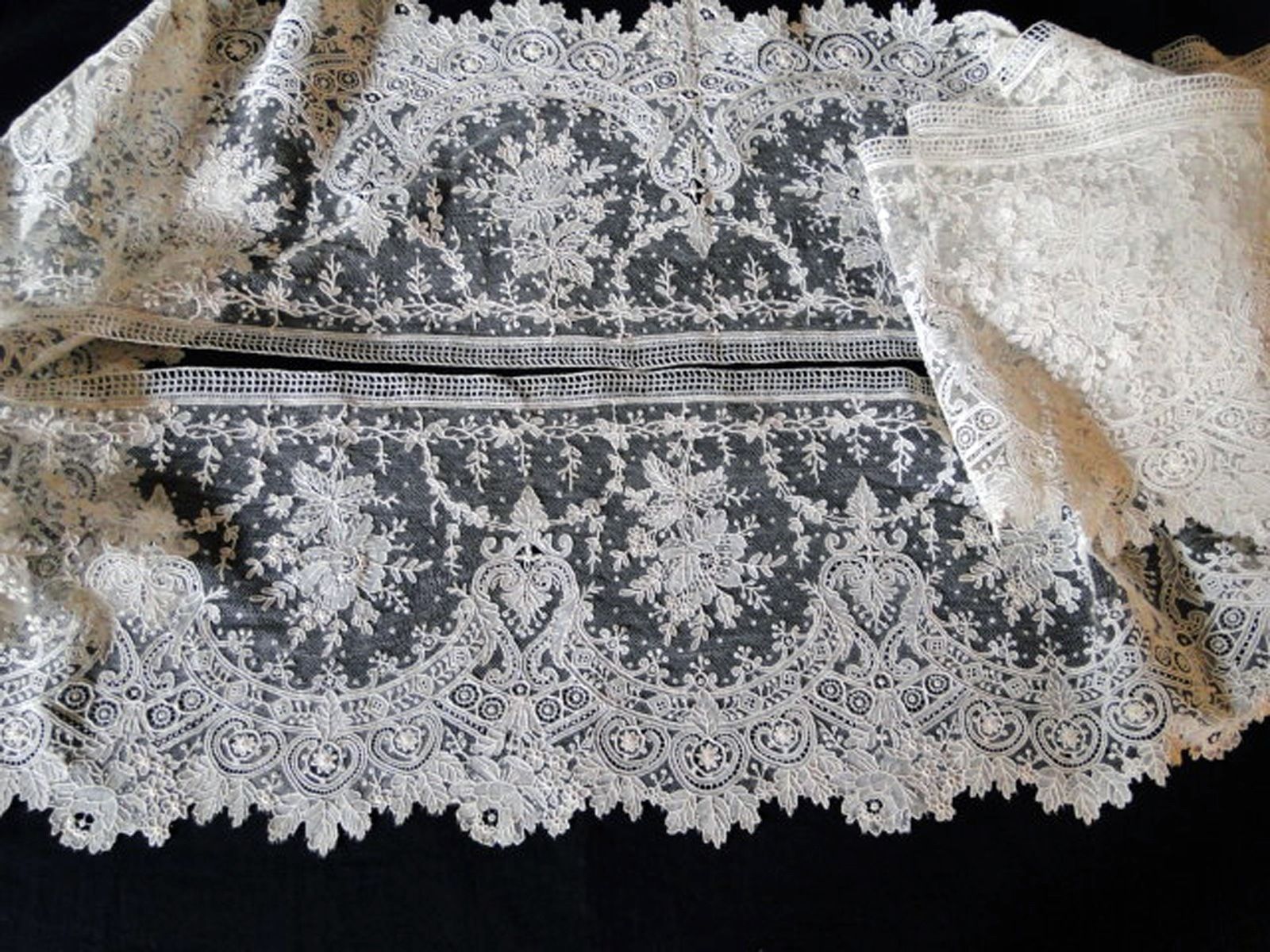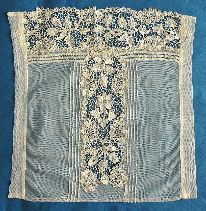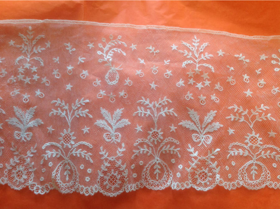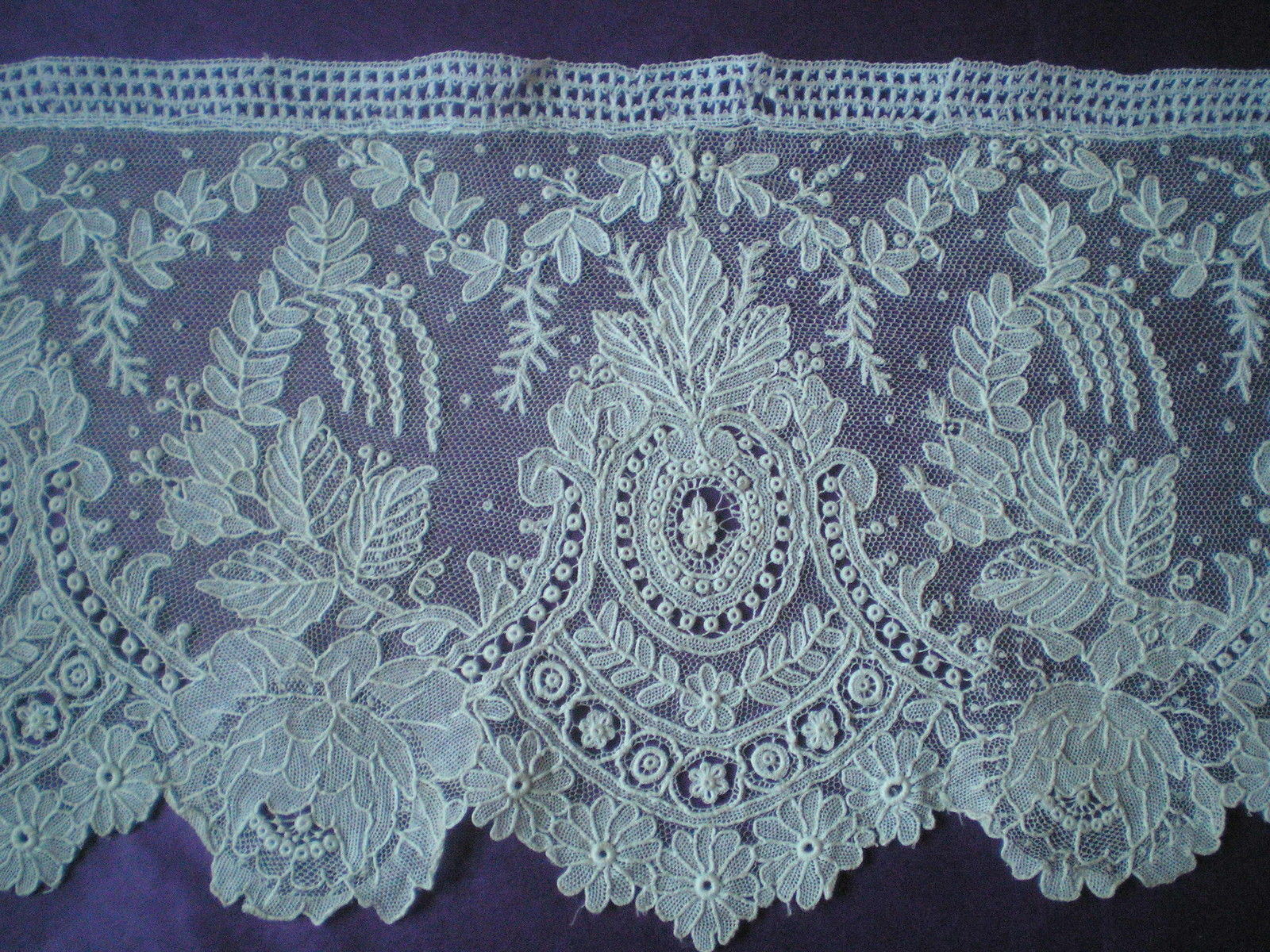 Comments: A border of Brussels bobbinlace applique on machine net. Although I almost think that some leaf sprays  and the stars look like needlerun or tambour – wish there were more closeups. But the bobbinlace applique that I can identify looks excellent, finely made with some very interesting fillings in the ovals along the border. I’m thinking some of these might be needlelace.  Overall quite an interesting piece.