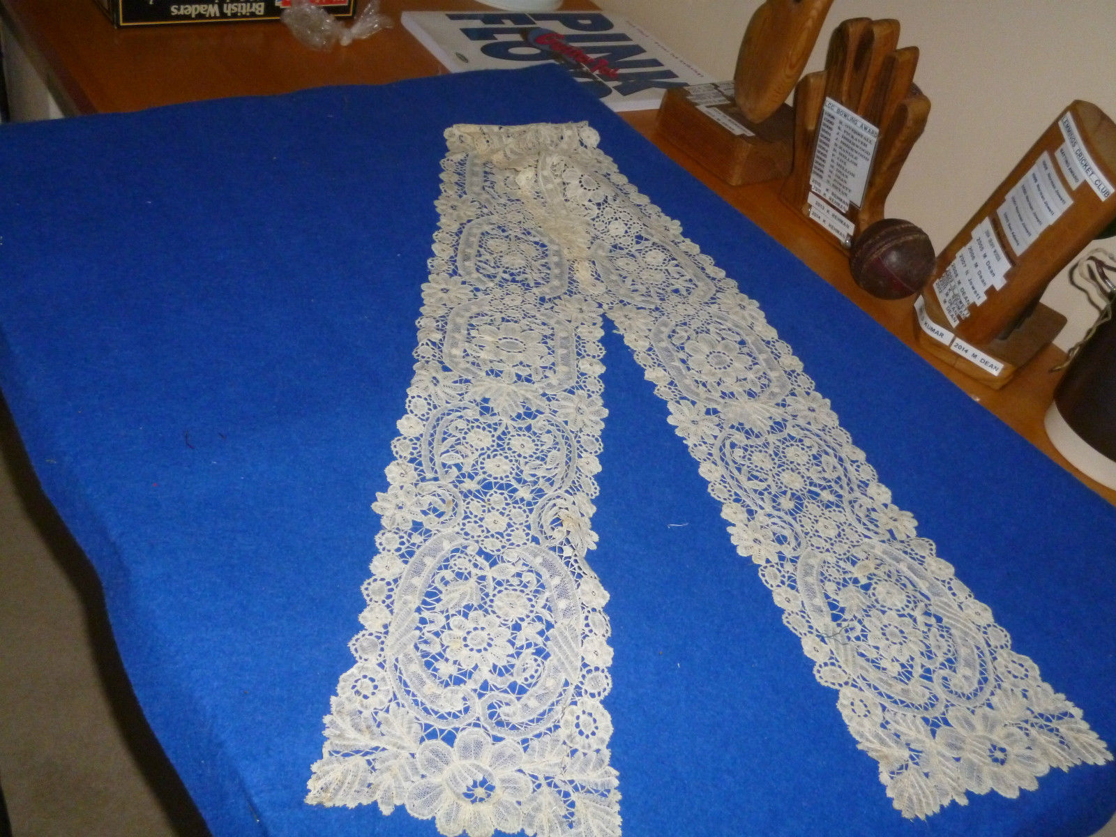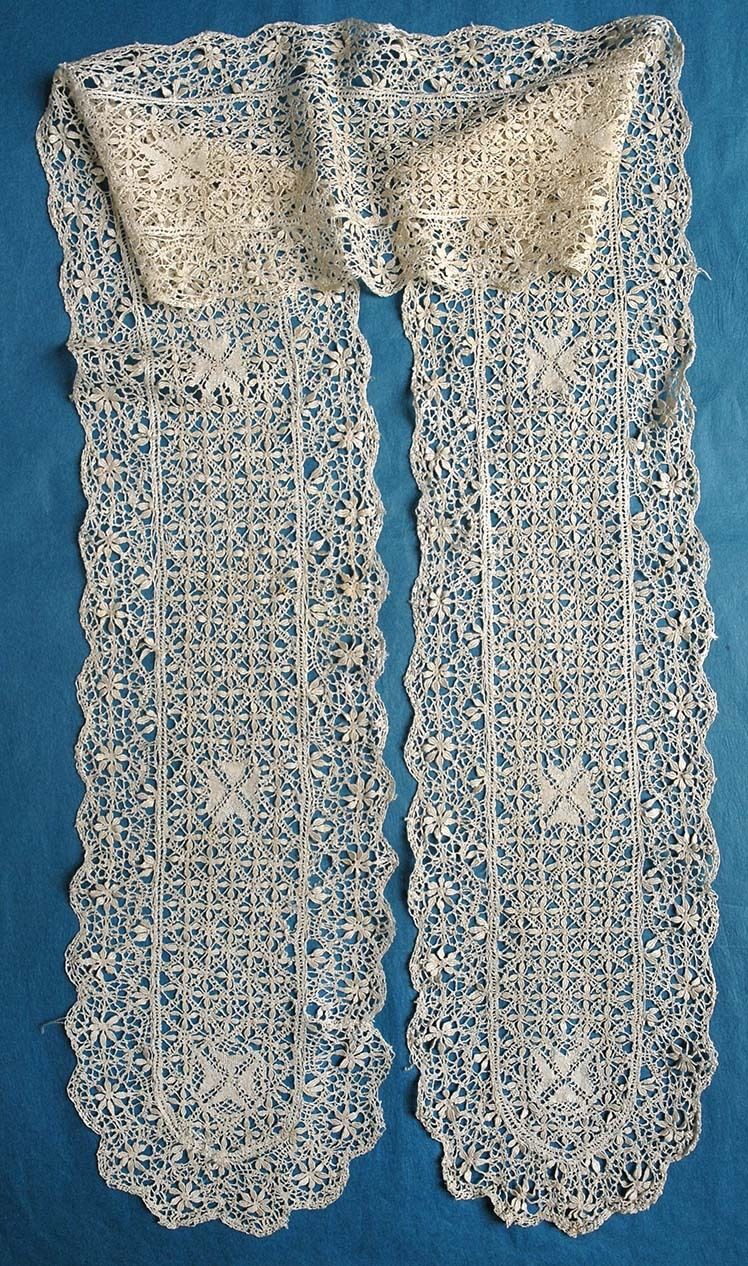 Comments: A lappet scarf of Maltese, which is difficult to see against the light background. It has a series of Maltese crosses alternating with flowers down the center, and guipure/woven leav designs around the edges.  Nice looking piece.