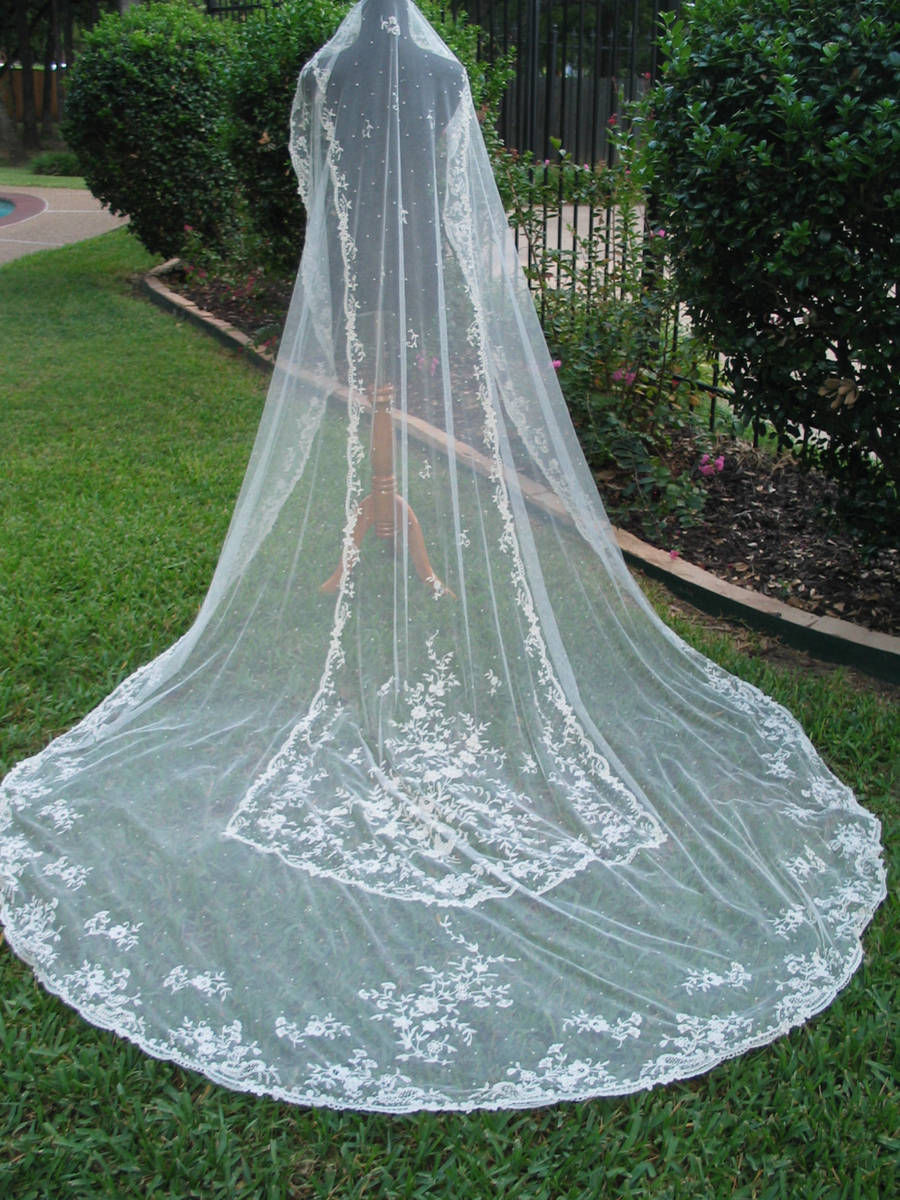 Comments: A wide, long Chantilly border. Romantic floral border – a little hard to see the flow since it only shown on the manikin. Esprits in the ground, scalloped swags along the lower border.  Design is a little large, but so is the piece.