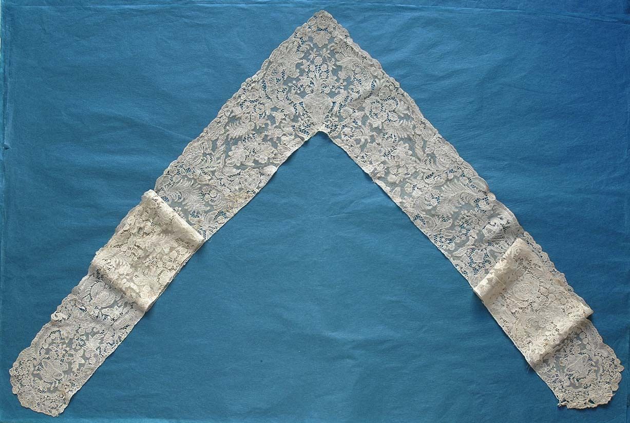 Comments: I can see what this wants to be.  It isn’t uncommon to have early 18th c lappets joined in a ‘V’ with what looks like a cap back, although it is unusual to find it with a bobbinlace with droschel ground.  (see the photo next to the listed piece, from my collection.  Usually you can clearly see where the joins were made.  And it is also unclear whether this joining was done in the 18th or 19th centuries.  I’ve got a feeling that is what this is, and the ‘lappets’ have been cut straight on the inner edges.  The cap piece and the lappets do seem to match in style, and note the extensive figural work.  I’m convinced that these are lappets because of the mirror image motifs, and looks at the rounded ends.  But I can’t find the join between the lappets and the headpiece. We could use more closeups of this area.Maybe around 1740, probably Brussels type.