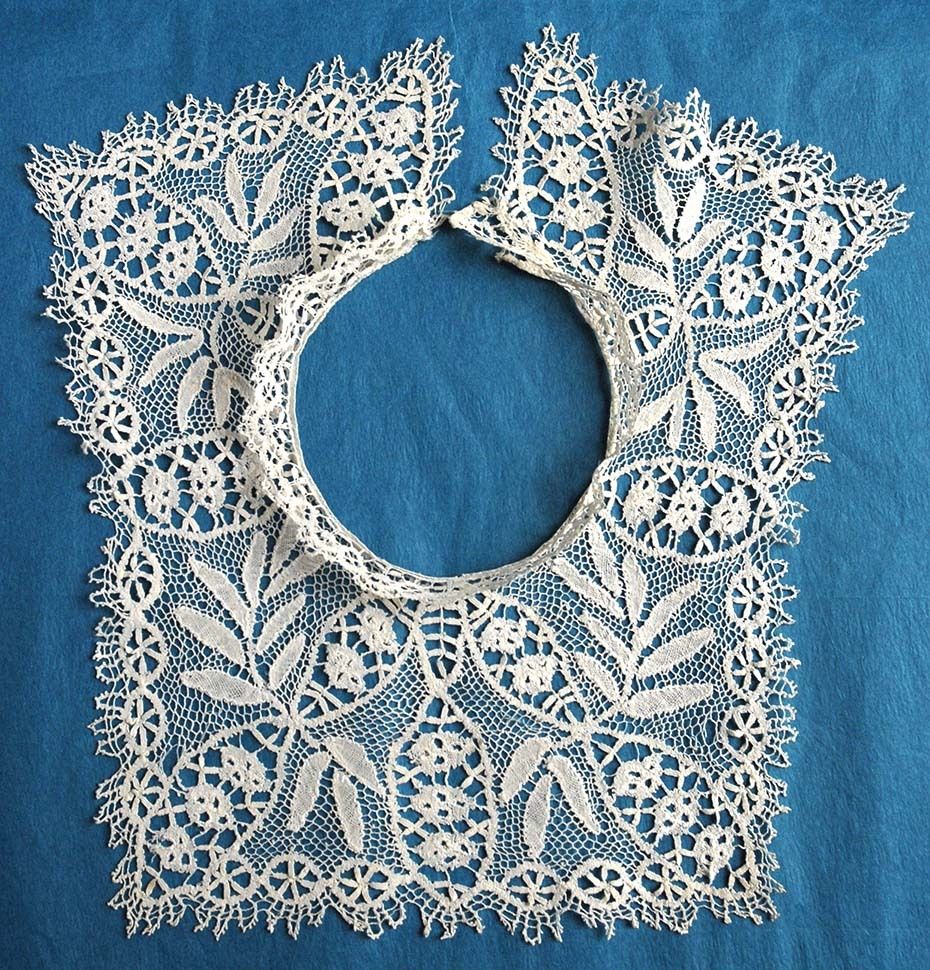 Comments: A Honiton collar, snails/slugs style, nicely made. I think the mesh is needlemade, which puts this in the Honiton Point category. Good areas of woven leadwork tallies, although not too extensive.  The piece has a very nice presence.