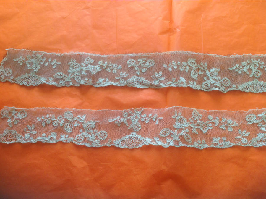 Modifications: Cut on all ends. One piece mounted on a black tulle with engrelure. Unmounted piece has wear along top  edge, and there’s a vertical repair or seam.