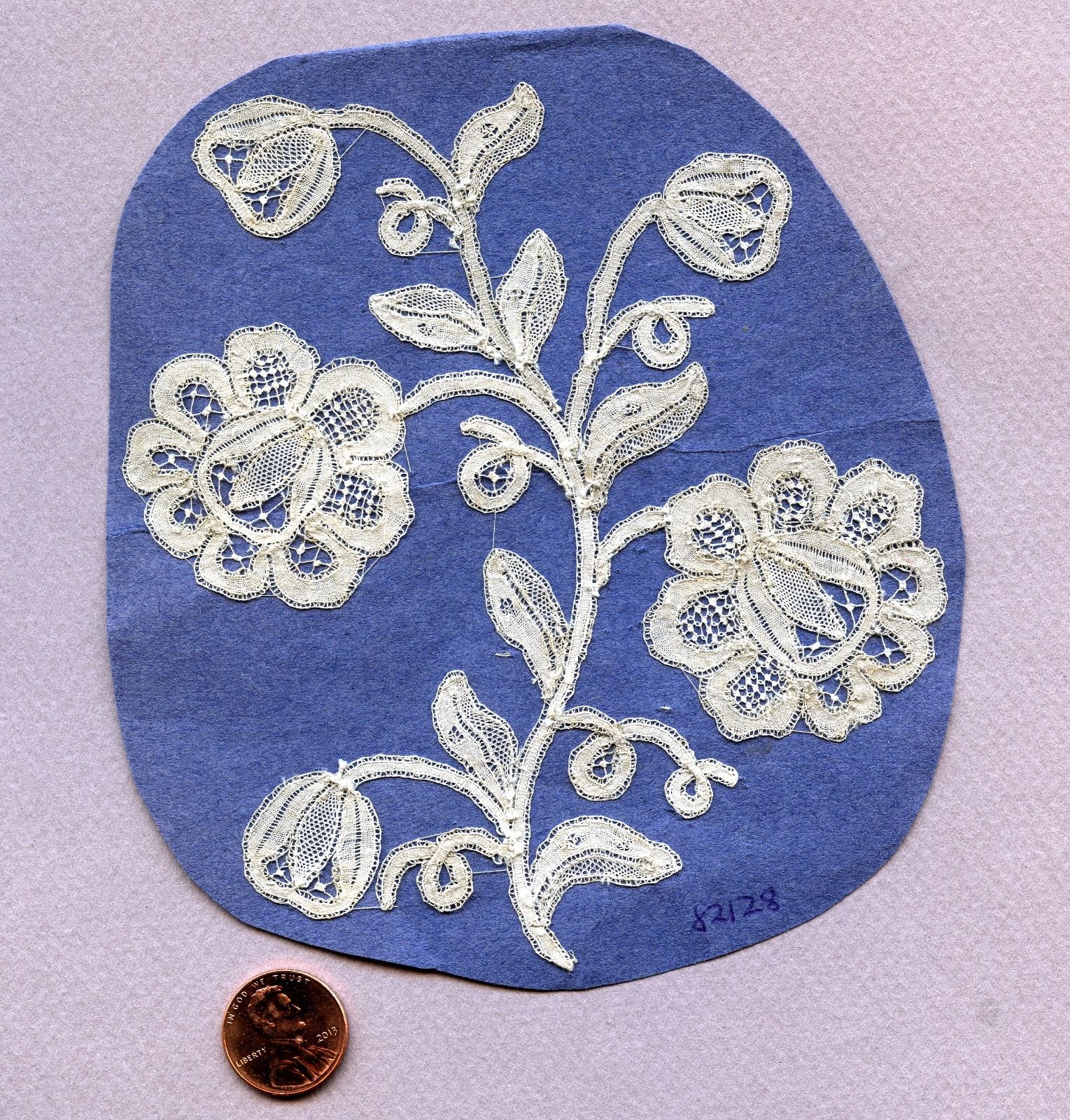Comments: Fairly wide border of Valenciennes. Densely woven design of 9-petaled flowers, feathery leaves, and scalloped border. Three spots/repeat in the upper ground.