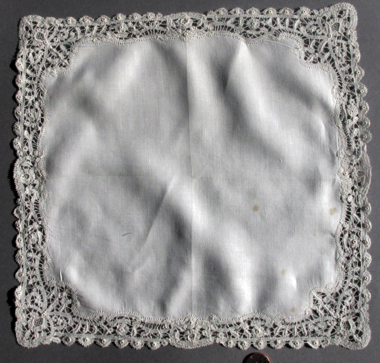 Finish: Hanky cloth and borders a little wrinkled.